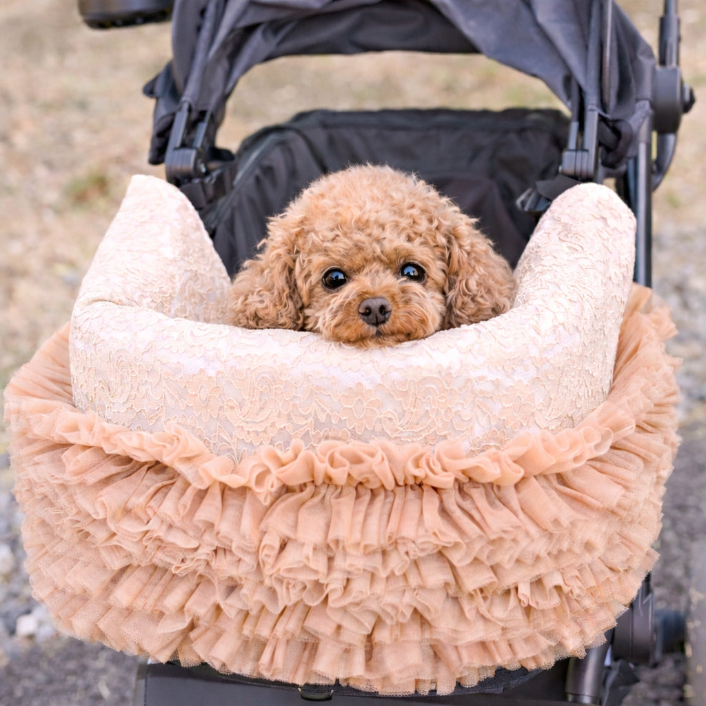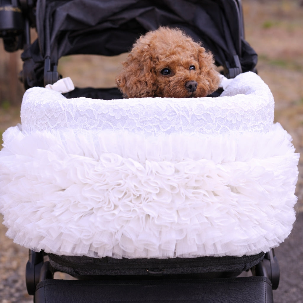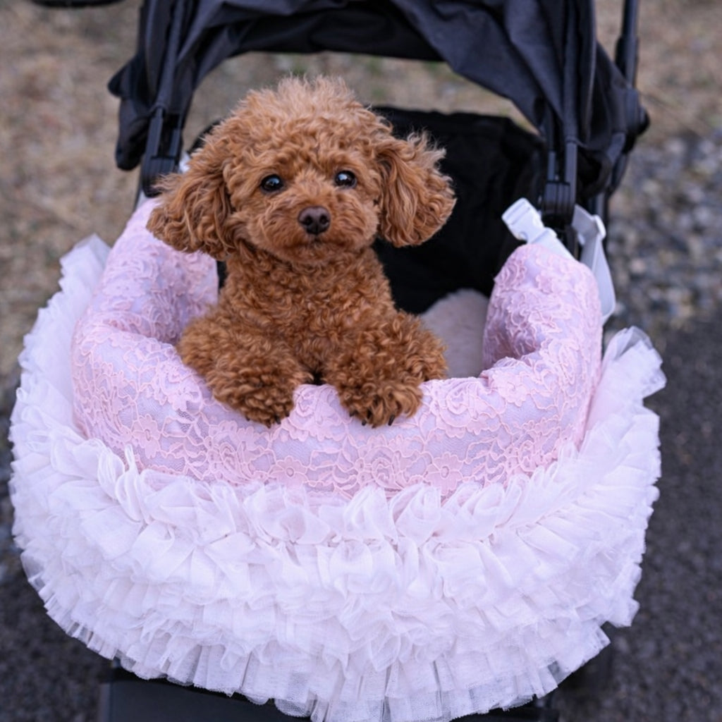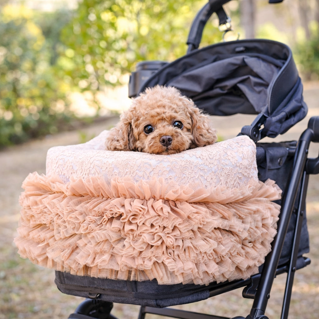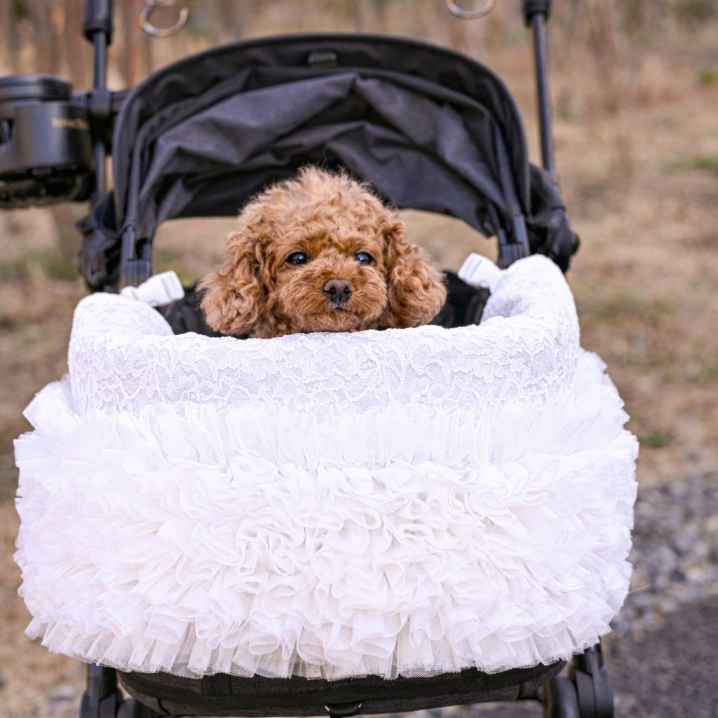 3月25日発送開始予定です。 カートを華やかに彩るレースチュールフリルカートカバー。 たっぷりと重ねたチュールフリルと繊細なレース生地が、いつものカートを上品で可愛らしい印象にしてくれます。 カートのフロントにふんわりと広がるデザインはお出かけやカフェでも愛犬をより可愛く引き立ててくれるアイテム。 軽やかなチュールと柔らかなレース素材で季節を問わずお使いいただけます。 カラー ホワイト清楚で華やかな印象。どんなお洋服にも合わせやすい定番カラー。 ピンクやさしいピンクが可愛らしくフェミニンなコーディネートにぴったり。 ベージュ落ち着いた上品カラー。大人っぽくナチュラルな雰囲気に。 フェイクファーカートカバーをお持ちの方へ 季節に合わせてカートカバーを変えることでお出かけコーディネートをより楽しめます。アジャスタブルナイロンベルトで装着するため、さまざまなペットカートに取り付け可能です。 エアバギー DOME3(レギュラー・ラージ)やロイヤルテイルズなどのカートにも対応しています。