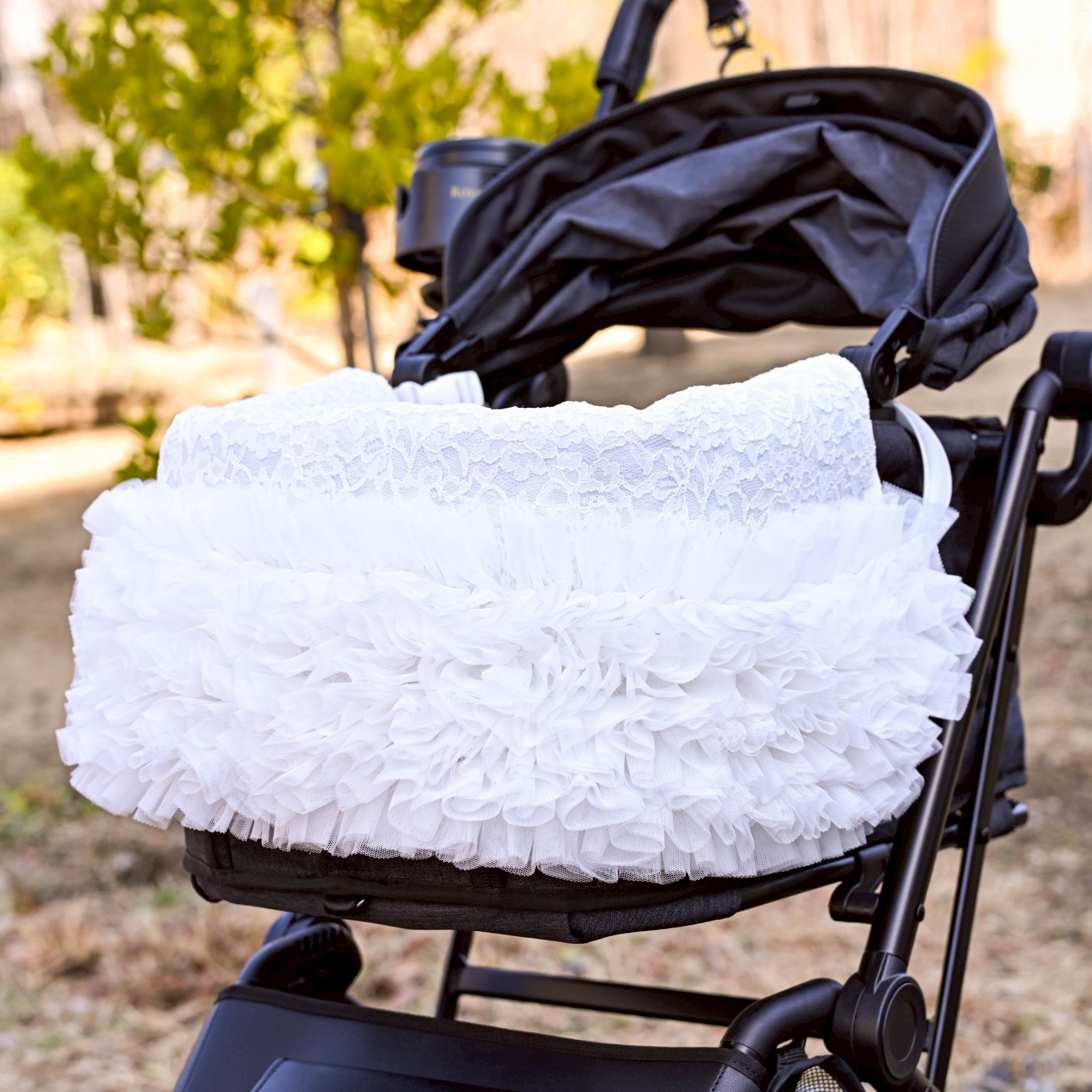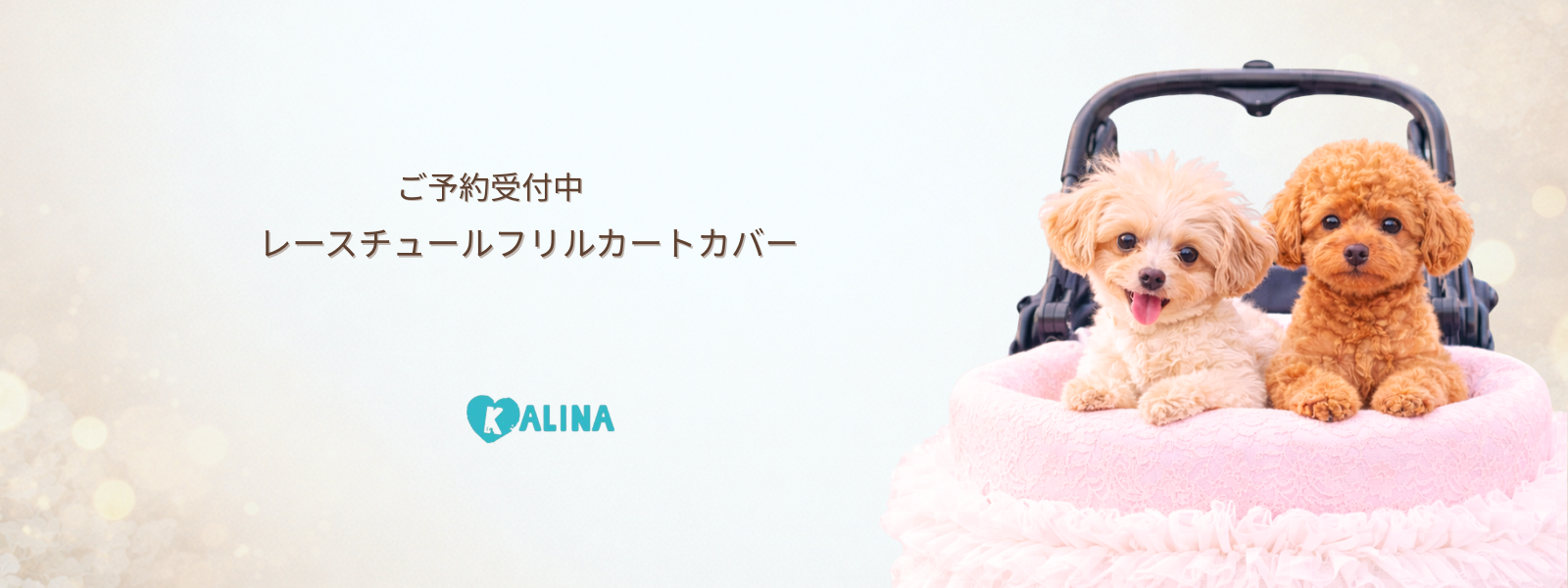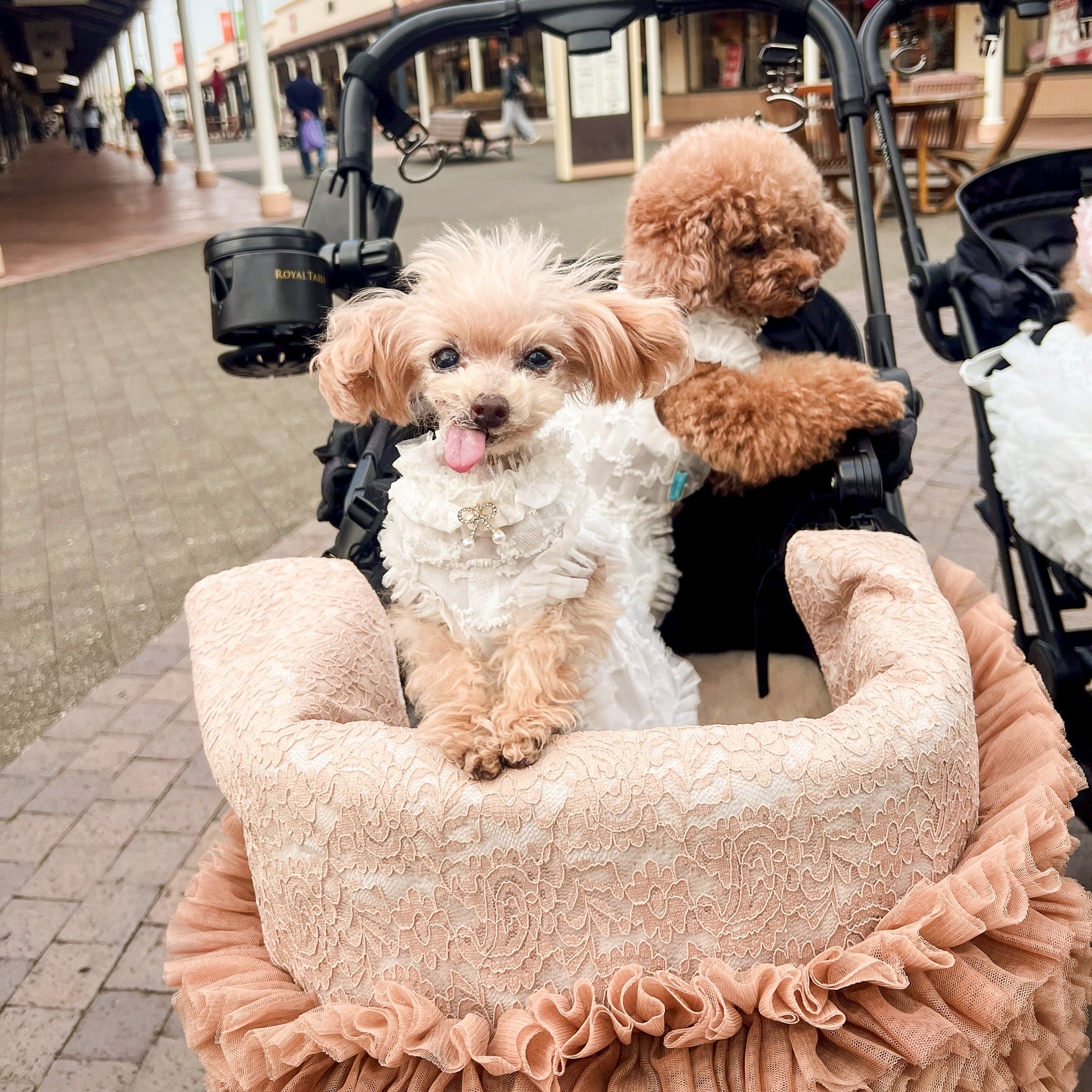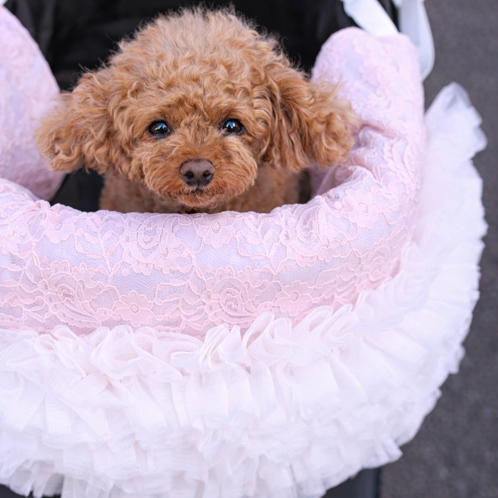 3月25日発送開始予定です。 カートを華やかに彩るレースチュールフリルカートカバー。 たっぷりと重ねたチュールフリルと繊細なレース生地が、いつものカートを上品で可愛らしい印象にしてくれます。 カートのフロントにふんわりと広がるデザインはお出かけやカフェでも愛犬をより可愛く引き立ててくれるアイテム。 軽やかなチュールと柔らかなレース素材で季節を問わずお使いいただけます。 カラー ホワイト清楚で華やかな印象。どんなお洋服にも合わせやすい定番カラー。 ピンクやさしいピンクが可愛らしくフェミニンなコーディネートにぴったり。 ベージュ落ち着いた上品カラー。大人っぽくナチュラルな雰囲気に。 フェイクファーカートカバーをお持ちの方へ 季節に合わせてカートカバーを変えることでお出かけコーディネートをより楽しめます。アジャスタブルナイロンベルトで装着するため、さまざまなペットカートに取り付け可能です。 エアバギー DOME3(レギュラー・ラージ)やロイヤルテイルズなどのカートにも対応しています。