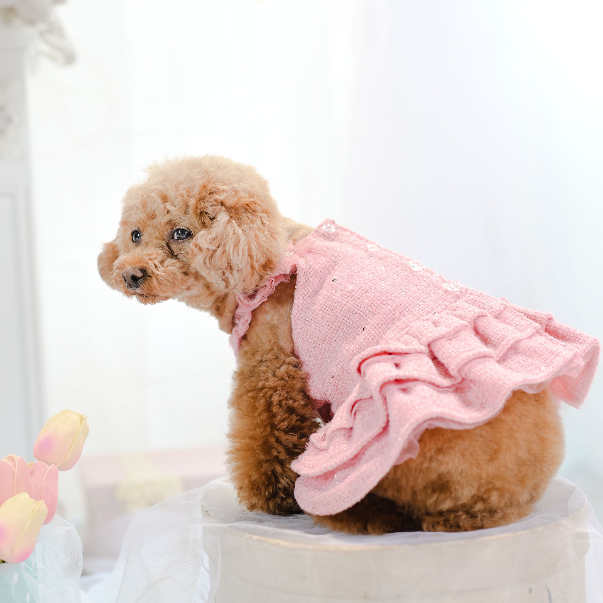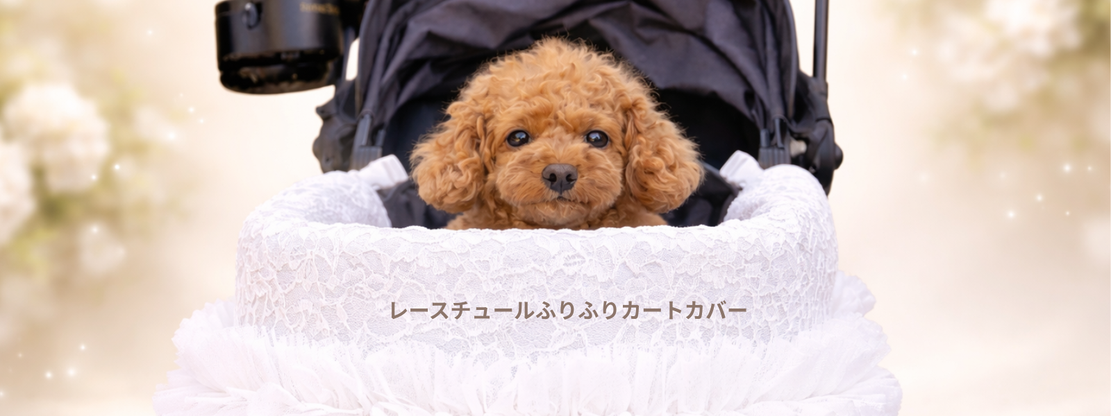 カートを華やかに彩るレースチュールフリルカートカバー。 たっぷりと重ねたチュールフリルと繊細なレース生地が、いつものカートを上品で可愛らしい印象にしてくれます。 カートのフロントにふんわりと広がるデザインはお出かけやカフェでも愛犬をより可愛く引き立ててくれるアイテム。 軽やかなチュールと柔らかなレース素材で季節を問わずお使いいただけます。 カラー ホワイト清楚で華やかな印象。どんなお洋服にも合わせやすい定番カラー。 ピンクやさしいピンクが可愛らしくフェミニンなコーディネートにぴったり。 ベージュ落ち着いた上品カラー。大人っぽくナチュラルな雰囲気に。 フェイクファーカートカバーをお持ちの方へ 季節に合わせてカートカバーを変えることでお出かけコーディネートをより楽しめます。アジャスタブルナイロンベルトで装着するため、さまざまなペットカートに取り付け可能です。 エアバギー DOME3(レギュラー・ラージ)やロイヤルテイルズなどのカートにも対応しています。