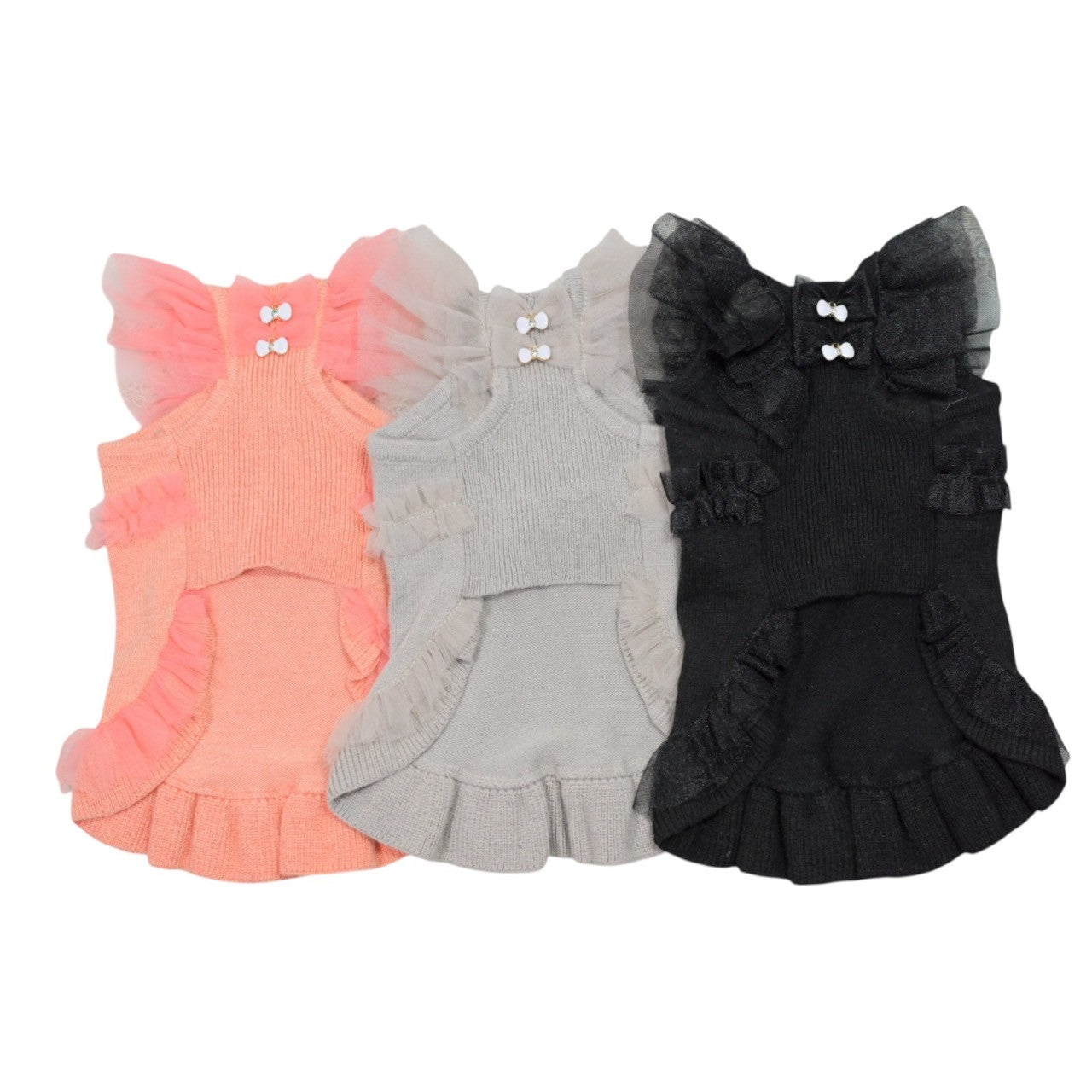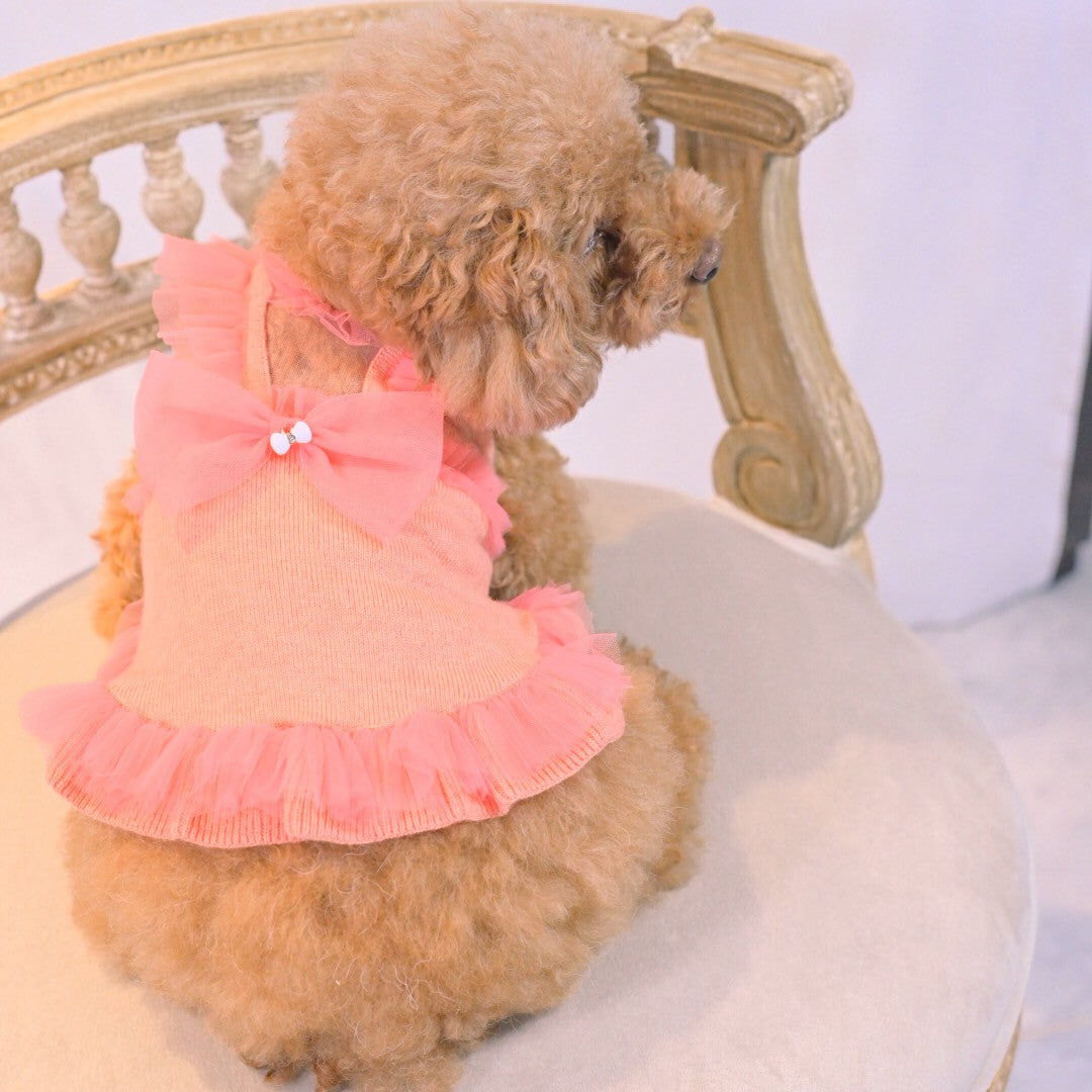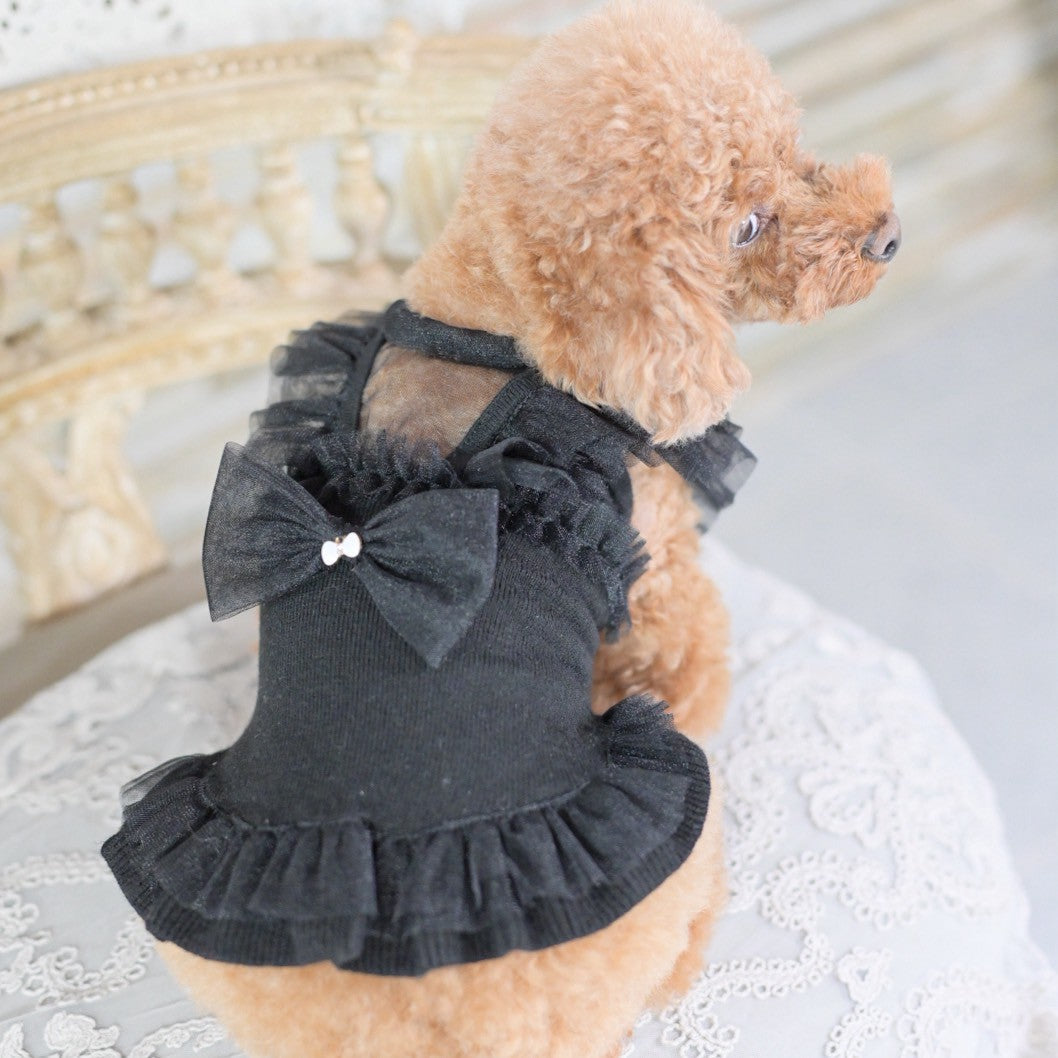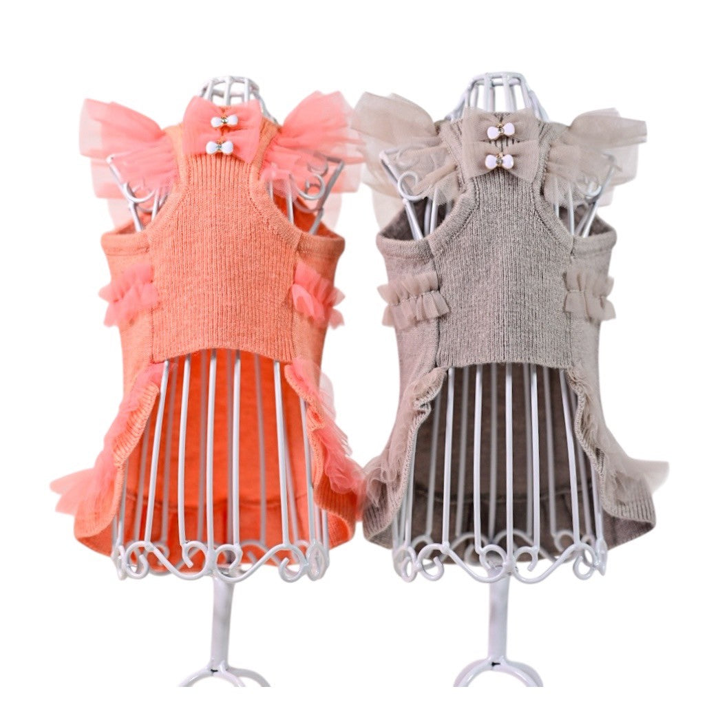 カシミヤ混素材を使った、柔らかで着心地の良いワンピース。新色 黒 を追加しました。 カラーは グレーベージュ・オレンジピンク・黒 の3色展開になります。 後身の大きなリボンと肩・裾のチュールフリルが、わんちゃんを華やかで可憐にみせてくれます。 背中の透けチュールが軽やかで、わんちゃんの髪の毛の色が透けて良い感じ。普段のお出かけから撮影会やイベントまで、幅広く活躍する一枚です。 カラー展開 オレンジピンク:明るく華やかで、ハロウィンコーデにもぴったり グレーベージュ:落ち着いたニュアンスカラーで、アンティークな雰囲気の撮影会におすすめ 黒:これからのハロクリシーズンにぴったりです。 ニット素材なので伸縮性あります。こちらの商品は 開きがありませんので 被って着用して頂くデザインです。