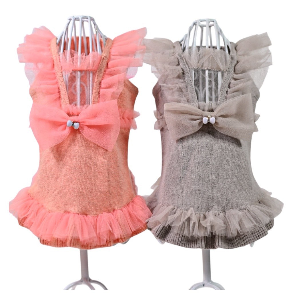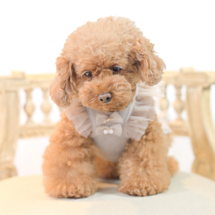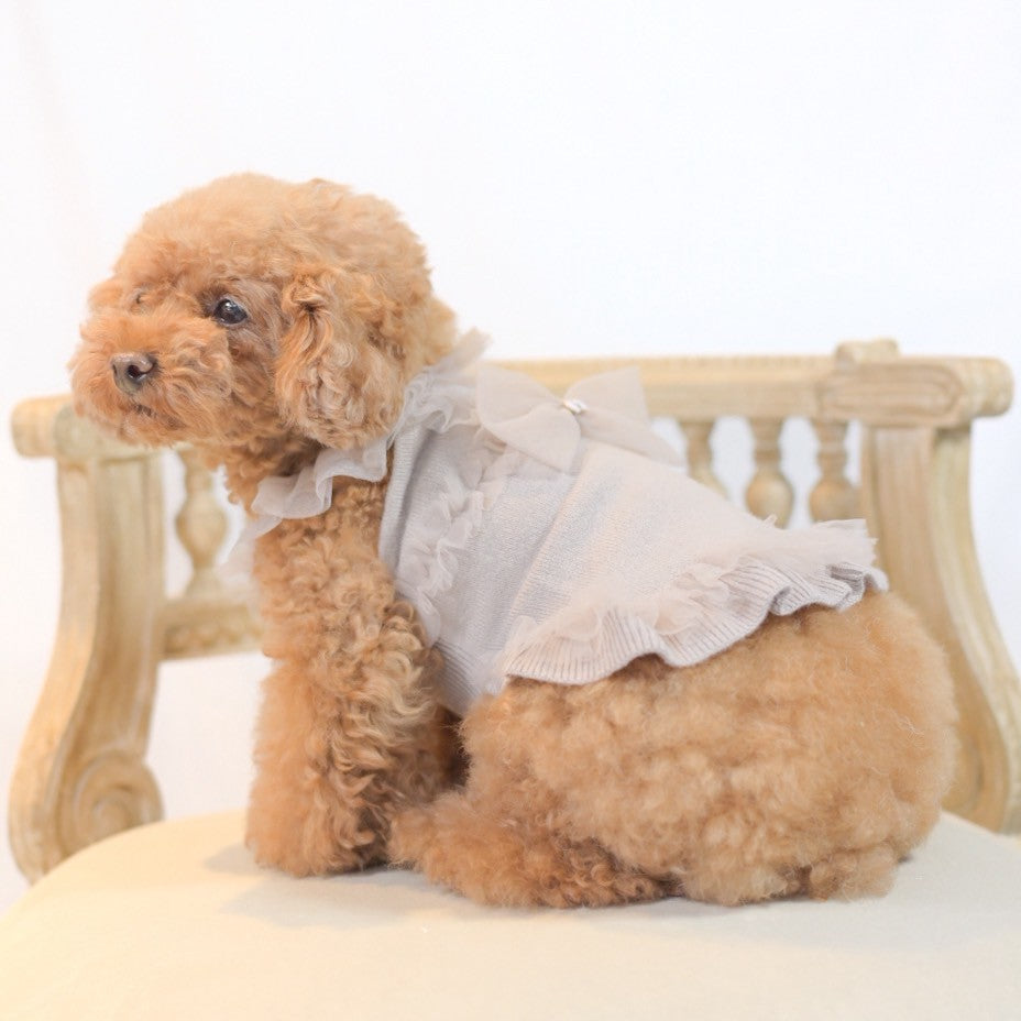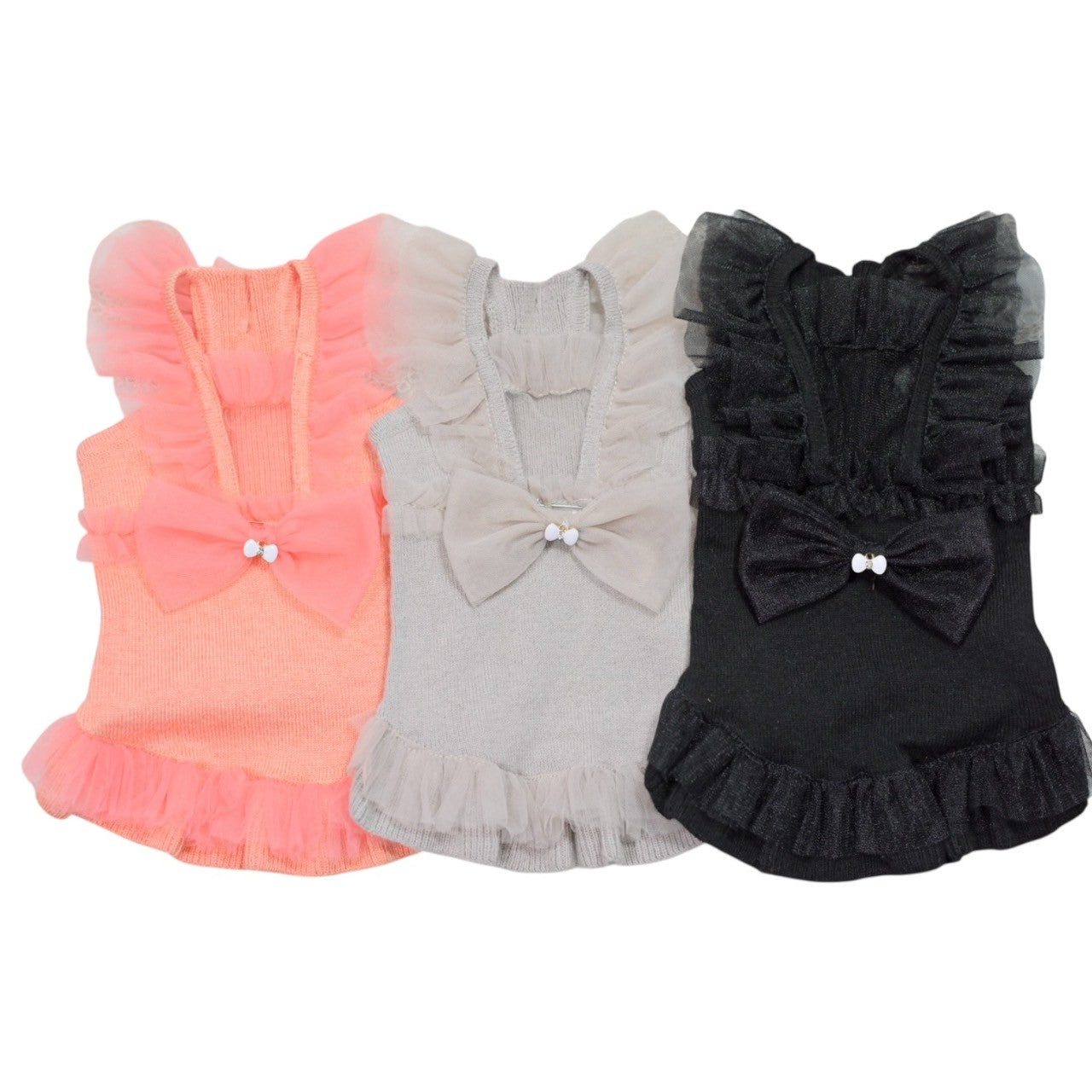 カシミヤ混素材を使った、柔らかで着心地の良いワンピース。新色 黒 を追加しました。 カラーは グレーベージュ・オレンジピンク・黒 の3色展開になります。 後身の大きなリボンと肩・裾のチュールフリルが、わんちゃんを華やかで可憐にみせてくれます。 背中の透けチュールが軽やかで、わんちゃんの髪の毛の色が透けて良い感じ。普段のお出かけから撮影会やイベントまで、幅広く活躍する一枚です。 カラー展開 オレンジピンク:明るく華やかで、ハロウィンコーデにもぴったり グレーベージュ:落ち着いたニュアンスカラーで、アンティークな雰囲気の撮影会におすすめ 黒:これからのハロクリシーズンにぴったりです。 ニット素材なので伸縮性あります。こちらの商品は 開きがありませんので 被って着用して頂くデザインです。