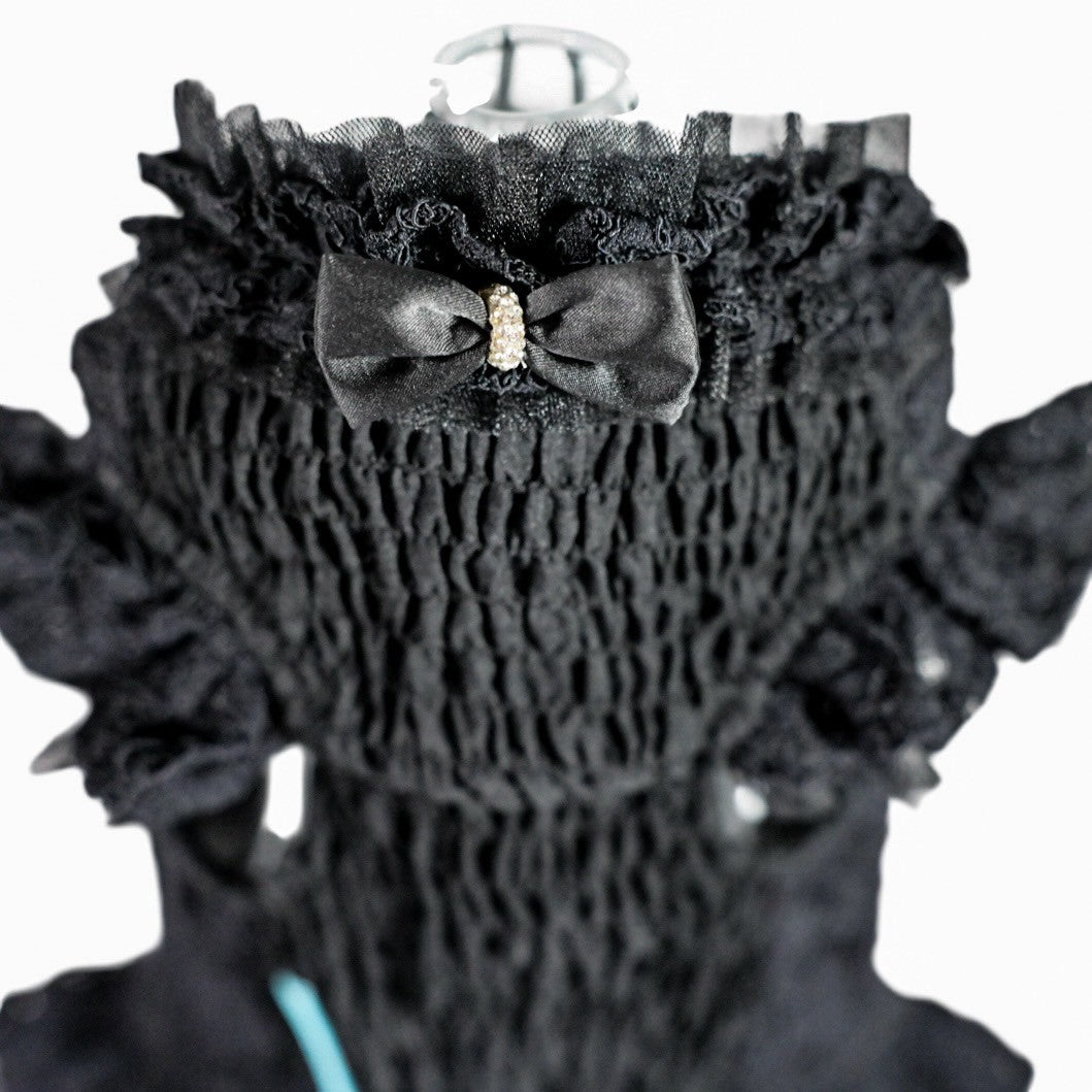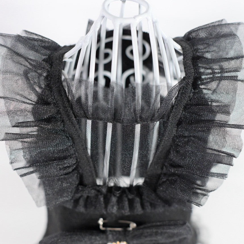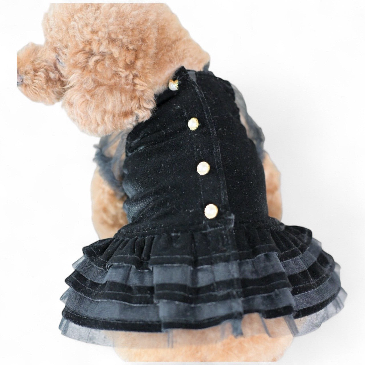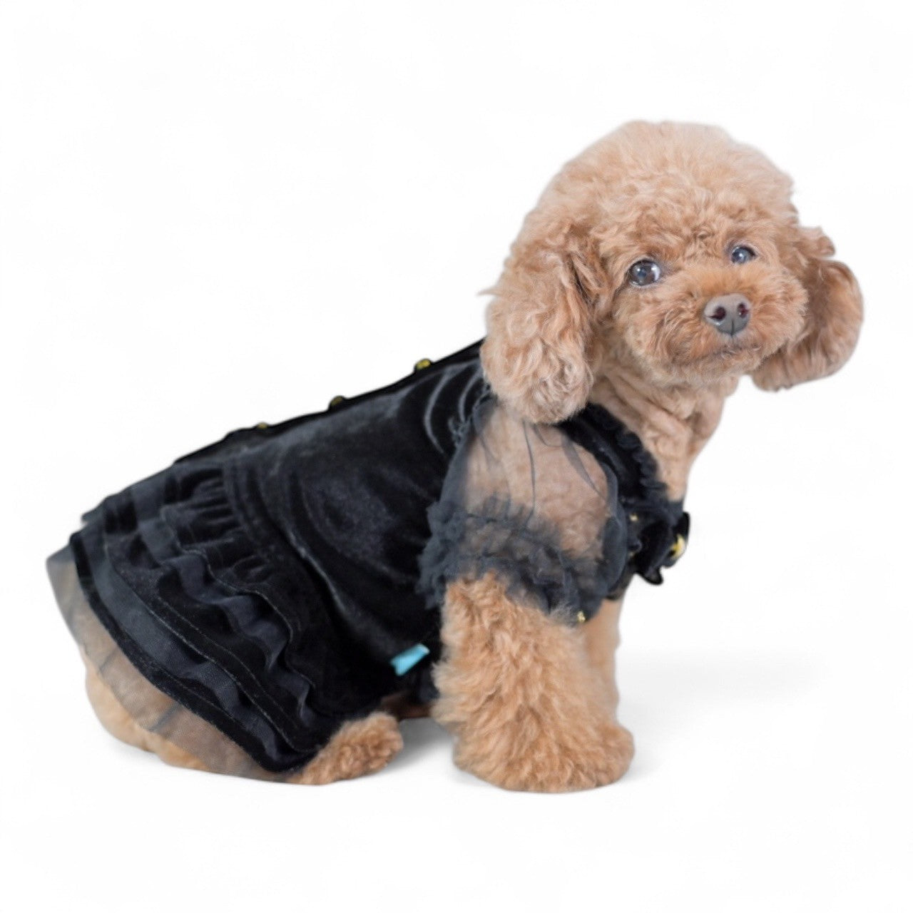 カシミヤ混素材を使った、柔らかで着心地の良いワンピース。新色 黒 を追加しました。 カラーは グレーベージュ・オレンジピンク・黒 の3色展開になります。 後身の大きなリボンと肩・裾のチュールフリルが、わんちゃんを華やかで可憐にみせてくれます。 背中の透けチュールが軽やかで、わんちゃんの髪の毛の色が透けて良い感じ。普段のお出かけから撮影会やイベントまで、幅広く活躍する一枚です。 カラー展開 オレンジピンク:明るく華やかで、ハロウィンコーデにもぴったり グレーベージュ:落ち着いたニュアンスカラーで、アンティークな雰囲気の撮影会におすすめ 黒:これからのハロクリシーズンにぴったりです。 ニット素材なので伸縮性あります。こちらの商品は 開きがありませんので 被って着用して頂くデザインです。