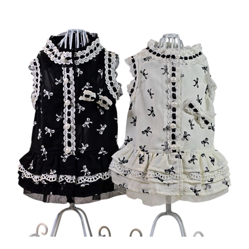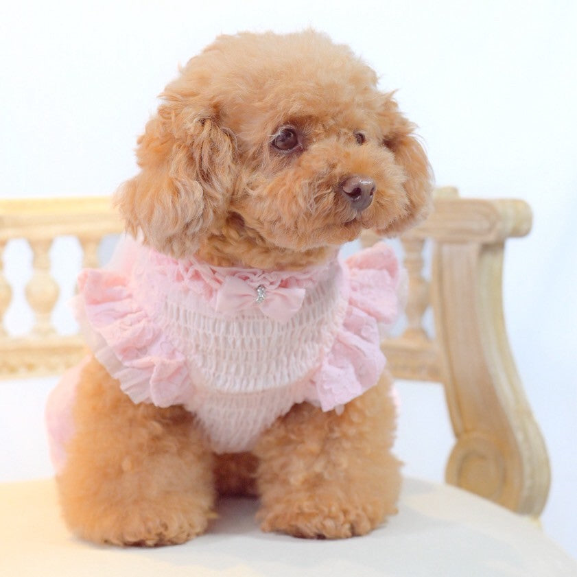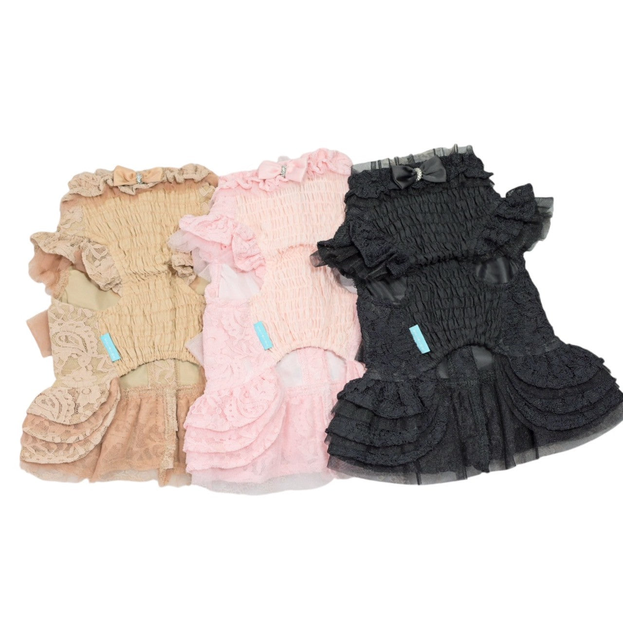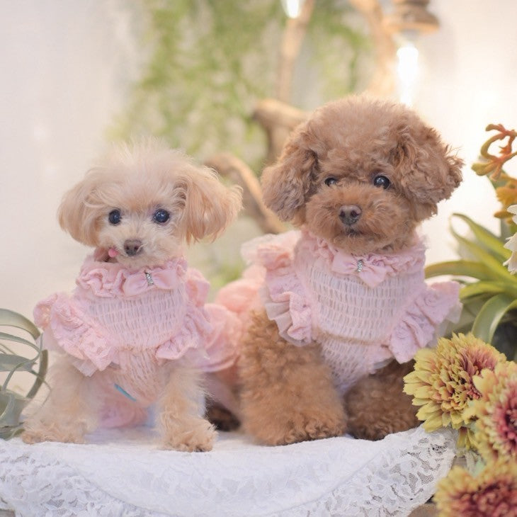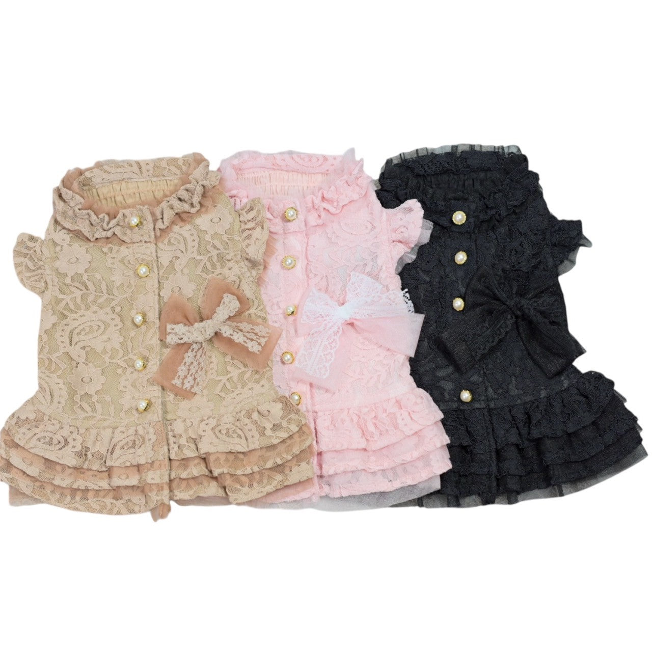 ※たくさんのご注文ありがとうございます。初回分完売の為 追加生産中です。商品の発送は 10月2日頃の 発送を予定しております。 新色 黒を追加しました。 前身がシャーリングになっているので とても着心地がよいですよ。 ふんわり可愛いシャーリングデザインに、繊細なレースを重ねた上品なワンピース。胸元のリボンとフリルがアクセントになり、特別なお出かけや記念撮影にもぴったりです。 なんと、このワンピースに使われている生地は 大人気「するっと履けるマナーパンツ」と同じ素材。通気性がよく、柔らかく伸縮性もあるので、わんこにとって快適な着心地です。 デザイン:前身はシャーリング加工で体にやさしくフィット 素材感:軽やかで柔らかい生地にレースをプラス カラー:ピンク(華やかで可愛い)、ベージュ(ナチュラルで上品)、黒(これからのシーズンにぴったり) ふんわり可愛いシャーリングデザインに、繊細なレースを重ねた上品なワンピース。胸元のリボンとフリルがアクセントになり、特別なお出かけや記念撮影にもぴったりです。 ポイント:人気マナーパンツと同じ生地で安心&快適 動きやすさと可愛さを兼ね備えた一着で、普段使いから撮影会、パーティーまで幅広く活躍します。 伸縮性はありません。後ろパチパチ釦あきで着脱らくらくです。