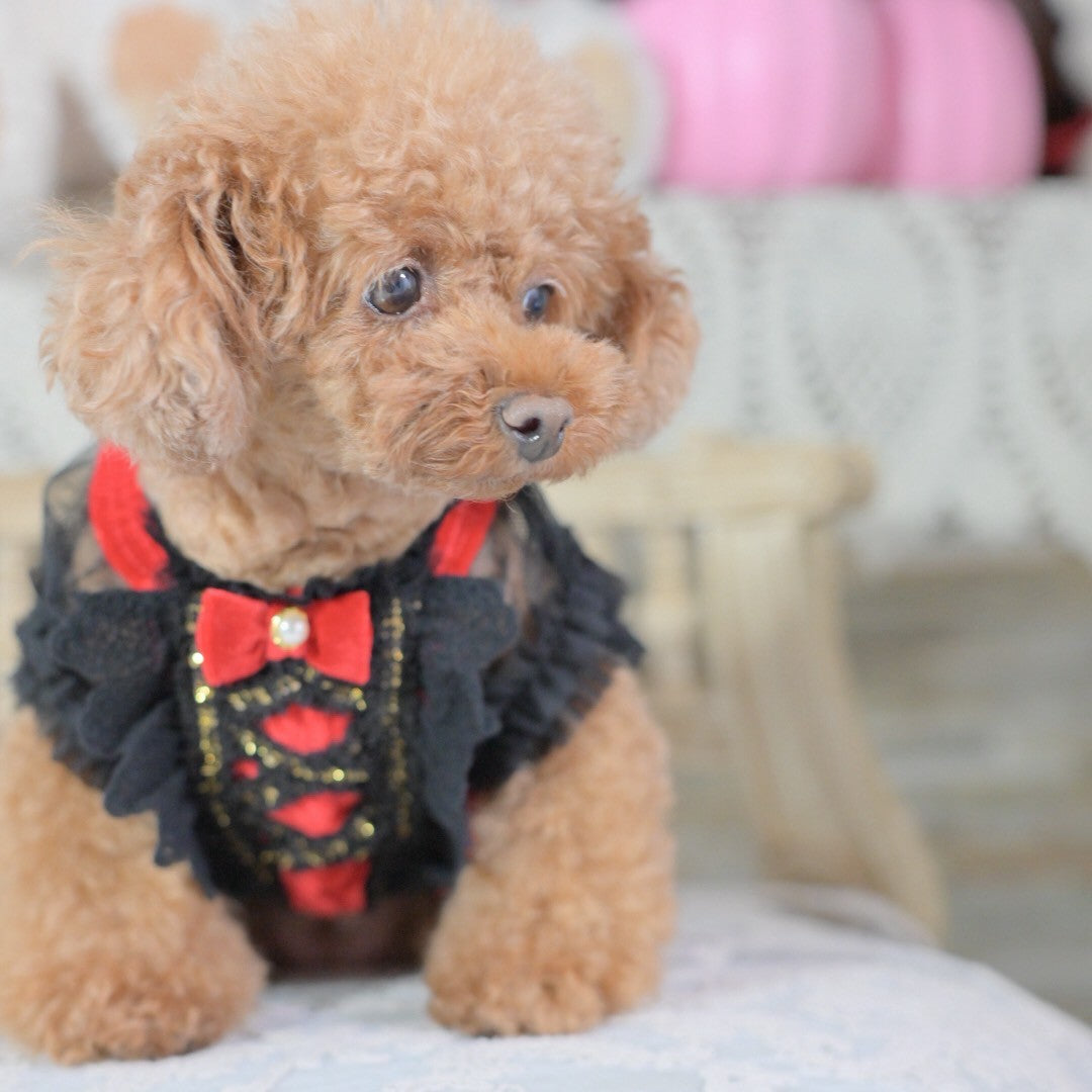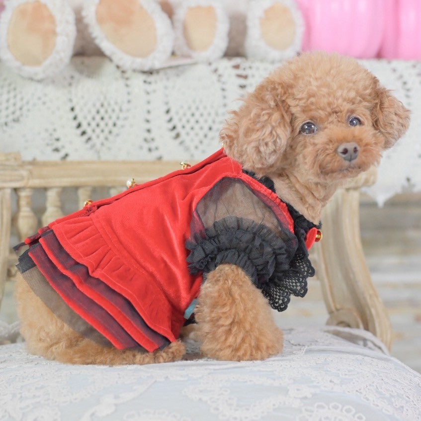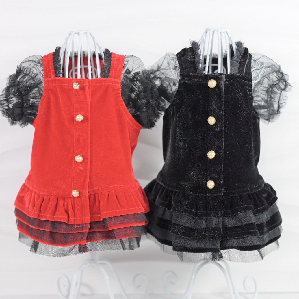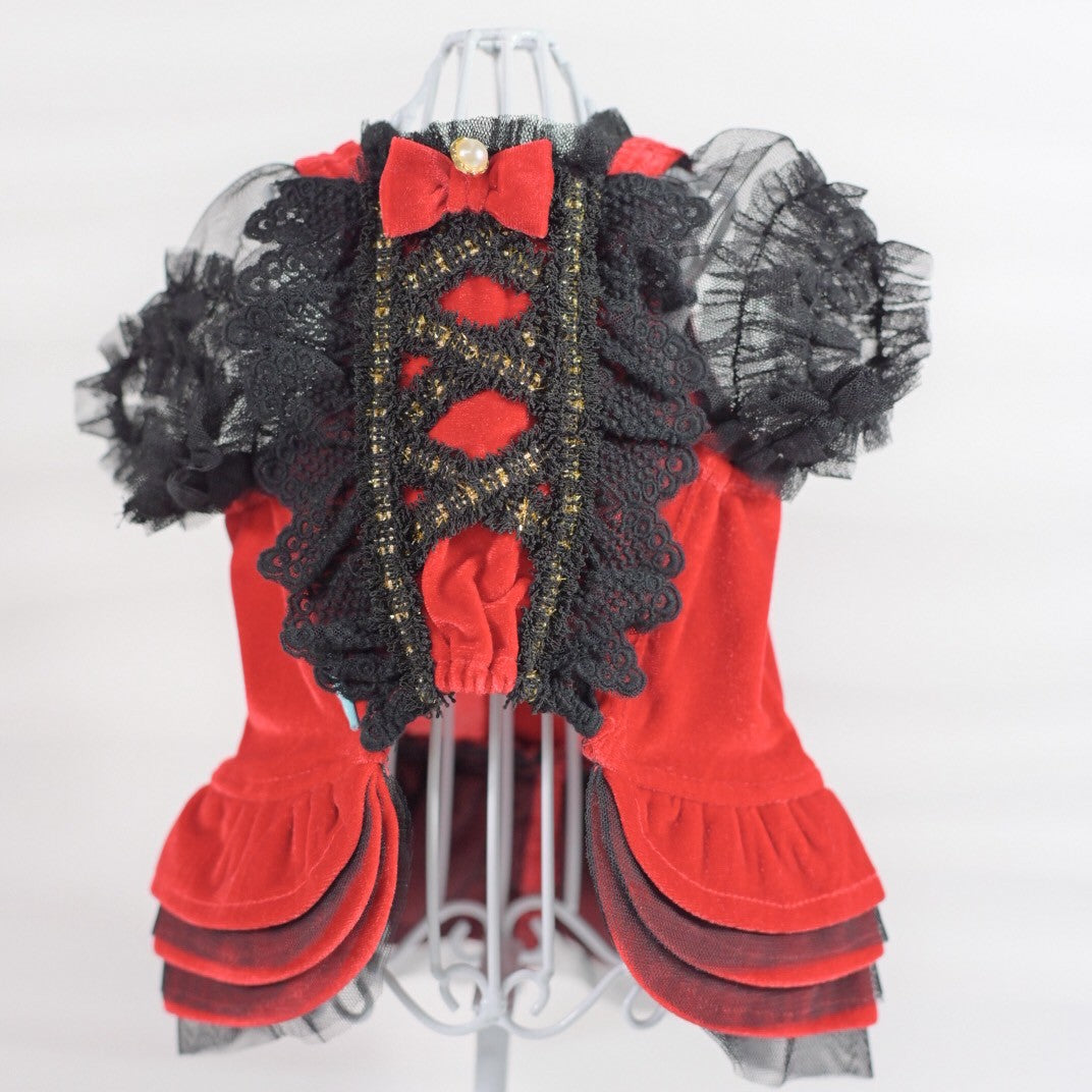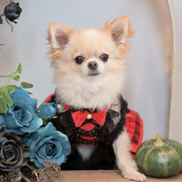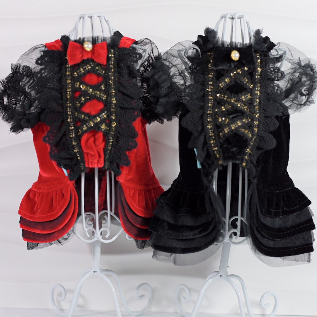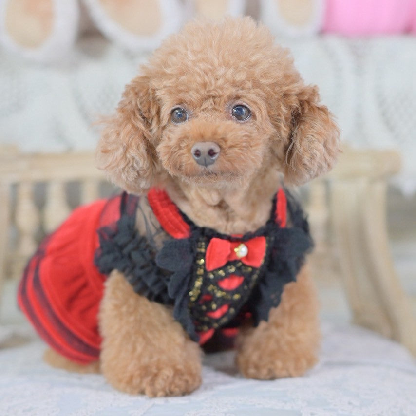 イベントが続くホリデーシーズンにぴったりのベルベットワンピース。カラーは ブラックとレッドの2色。 シックなブラックは“大人ハロウィン”やフォーマルなシーンにおすすめ。クラシカルなレッドはクリスマスの特別な日に華やかさを添えてくれます。 胸元はゴールドレースのレースアップで華やかに背中はパールボタンで上品さと着脱のしやすさを両立。 スカート部分はベルベットとチュールの二枚重ねフリルでふ んわりと、とっても可愛い仕上がりに季節のイベントを特別に彩る、おめかしワンピースです。※商品の発送は、10月10日を予定しています。