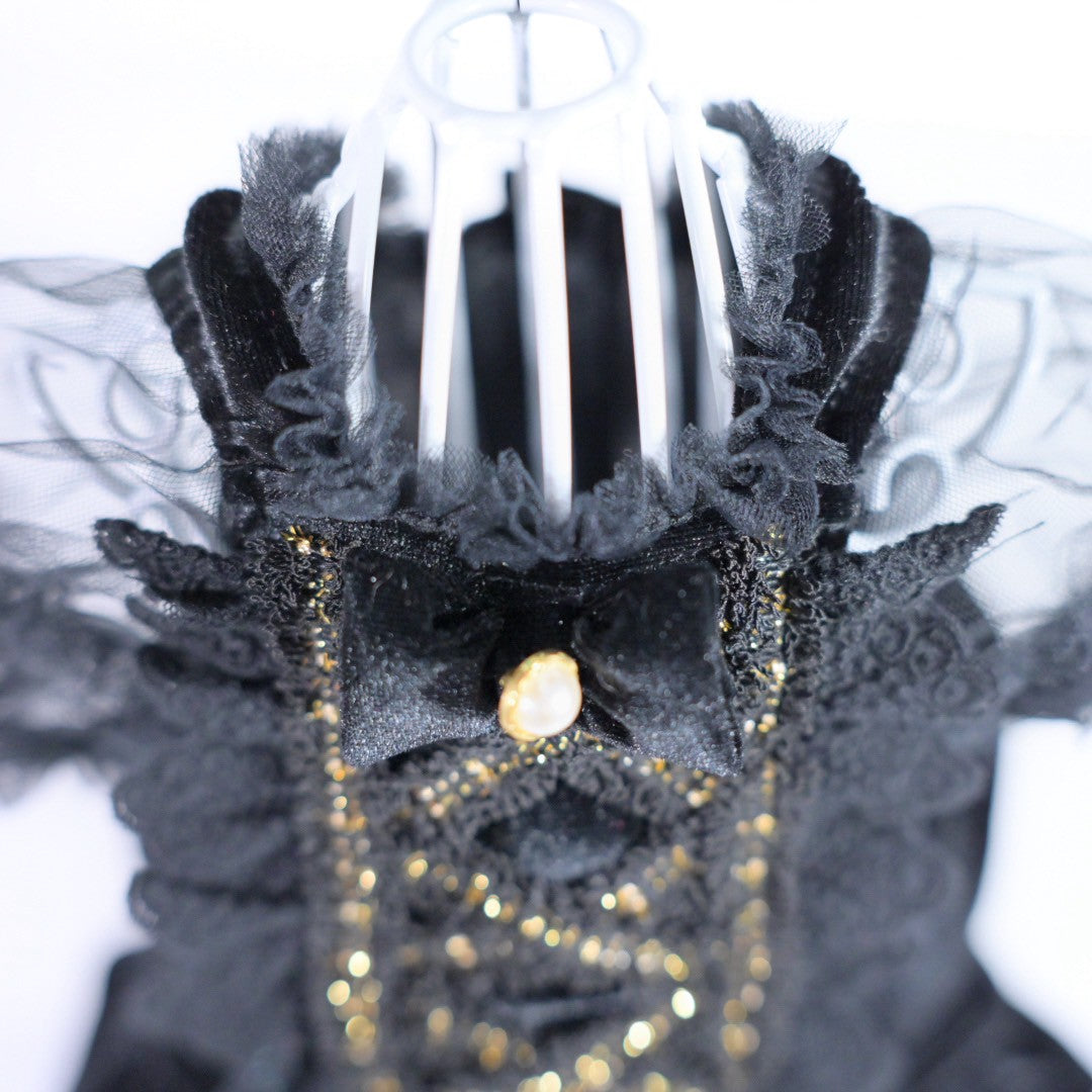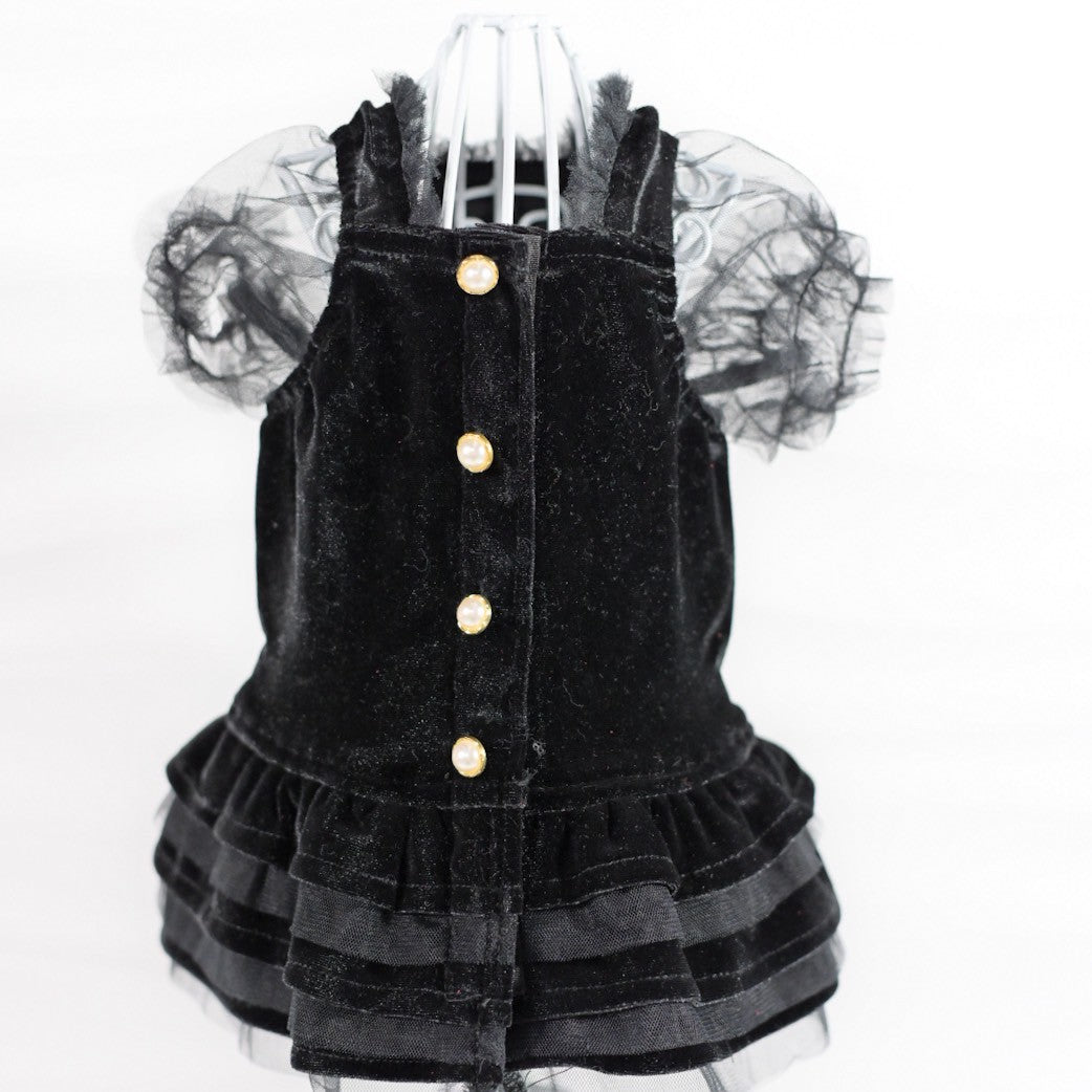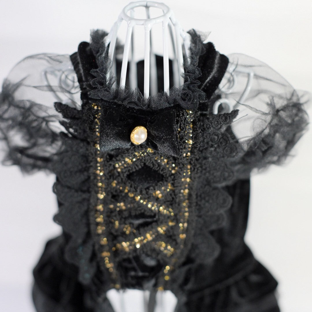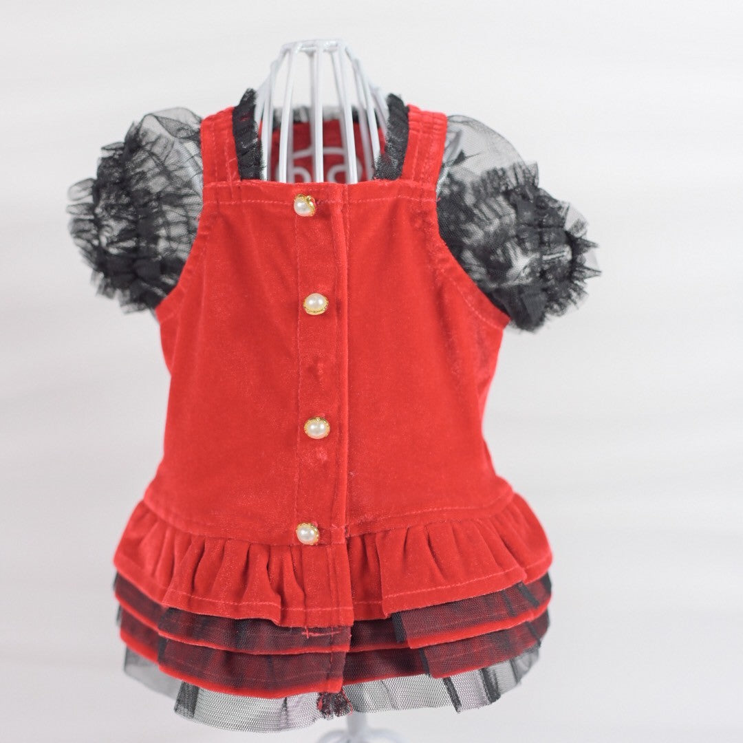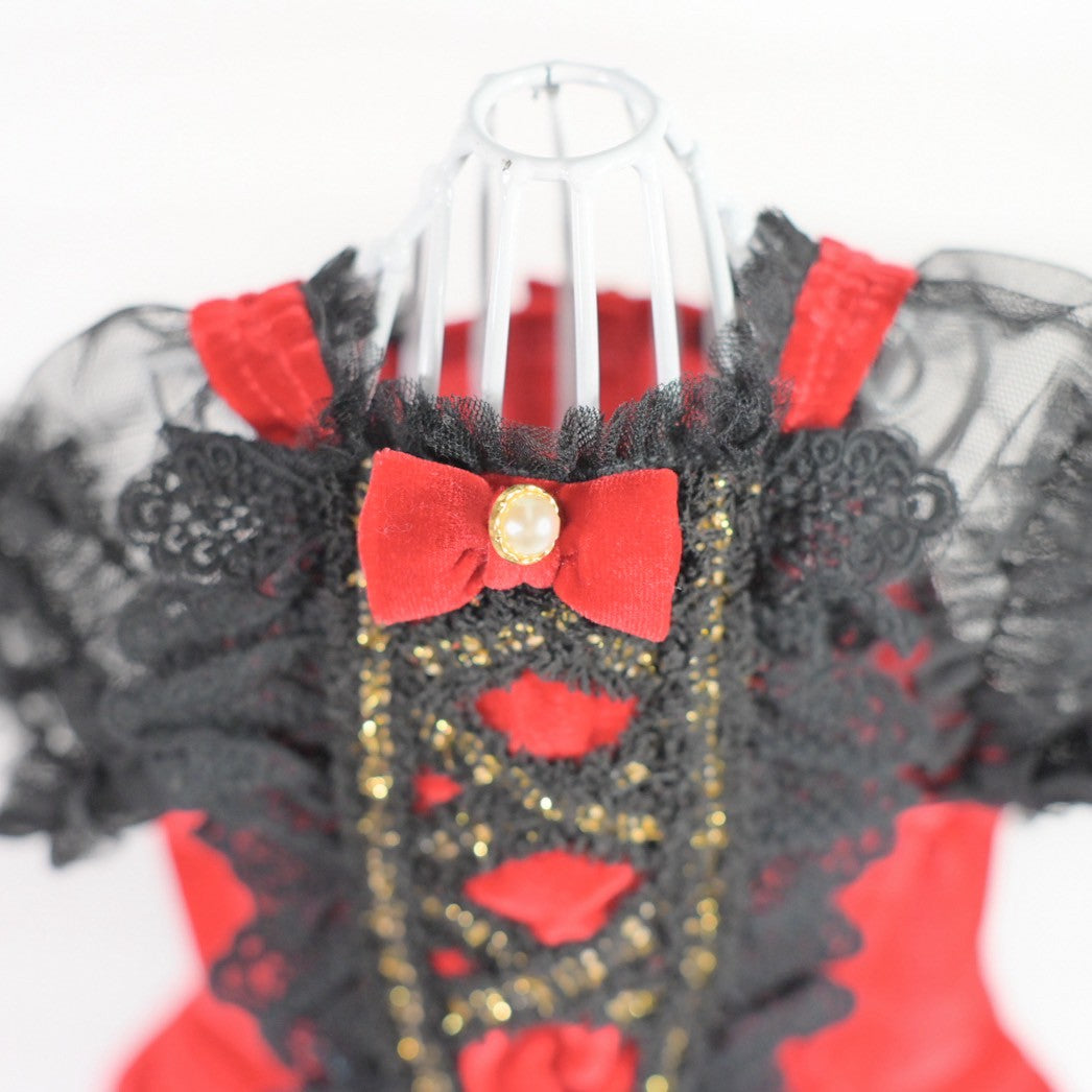 イベントが続くホリデーシーズンにぴったりのベルベットワンピース。カラーは ブラックとレッドの2色。 シックなブラックは“大人ハロウィン”やフォーマルなシーンにおすすめ。クラシカルなレッドはクリスマスの特別な日に華やかさを添えてくれます。 胸元はゴールドレースのレースアップで華やかに背中はパールボタンで上品さと着脱のしやすさを両立。 スカート部分はベルベットとチュールの二枚重ねフリルでふ んわりと、とっても可愛い仕上がりに季節のイベントを特別に彩る、おめかしワンピースです。※商品の発送は、10月10日を予定しています。