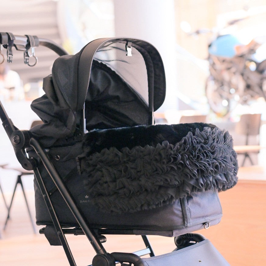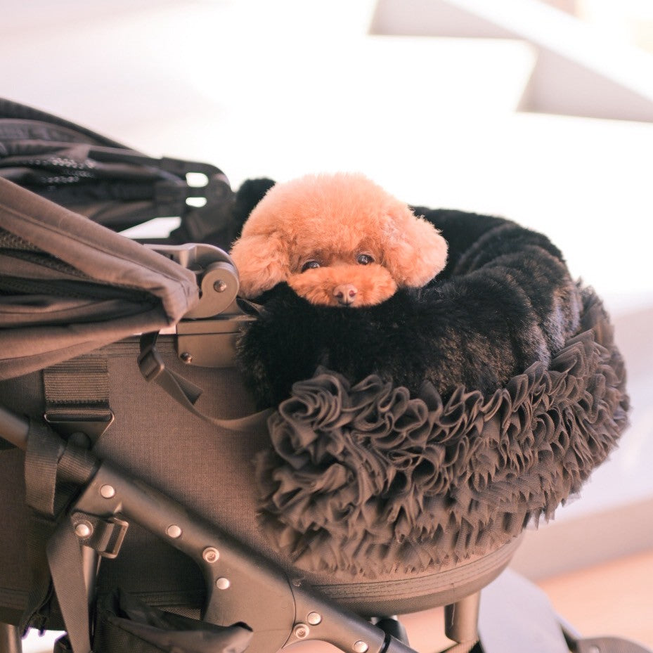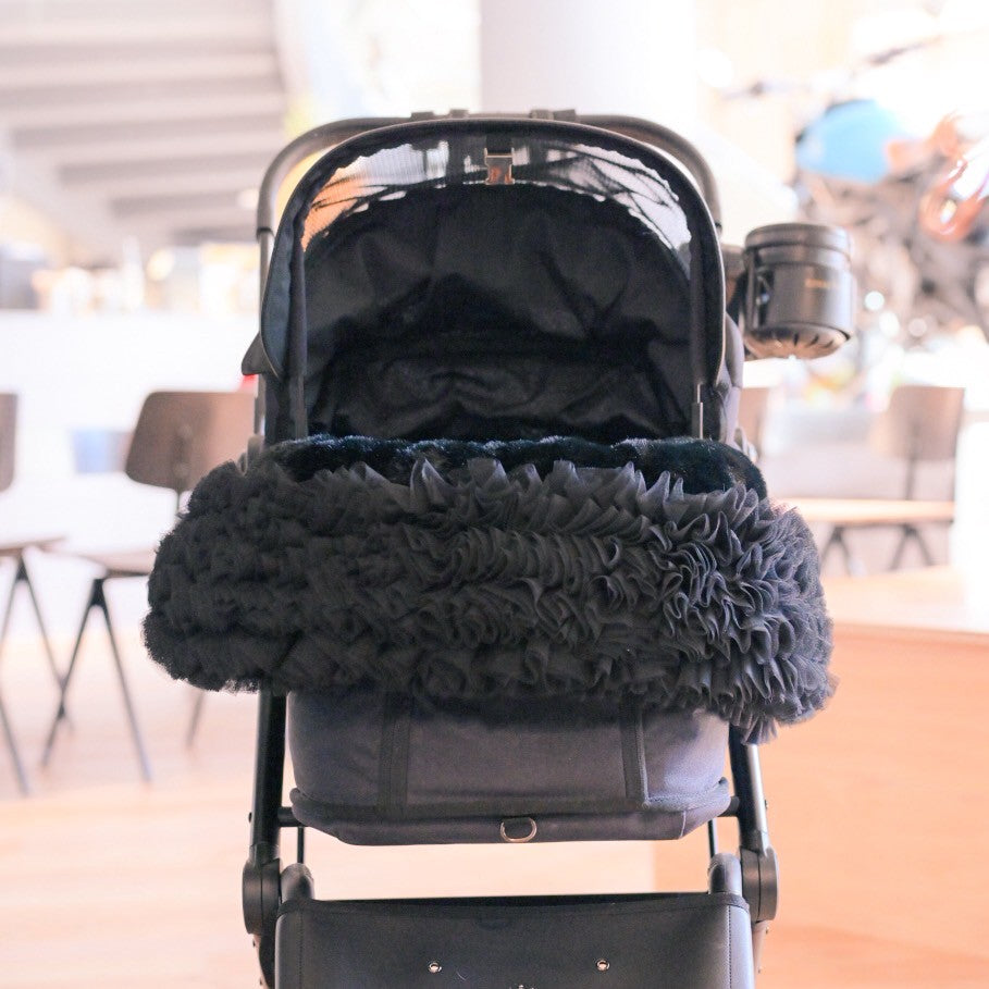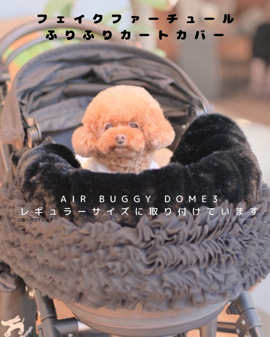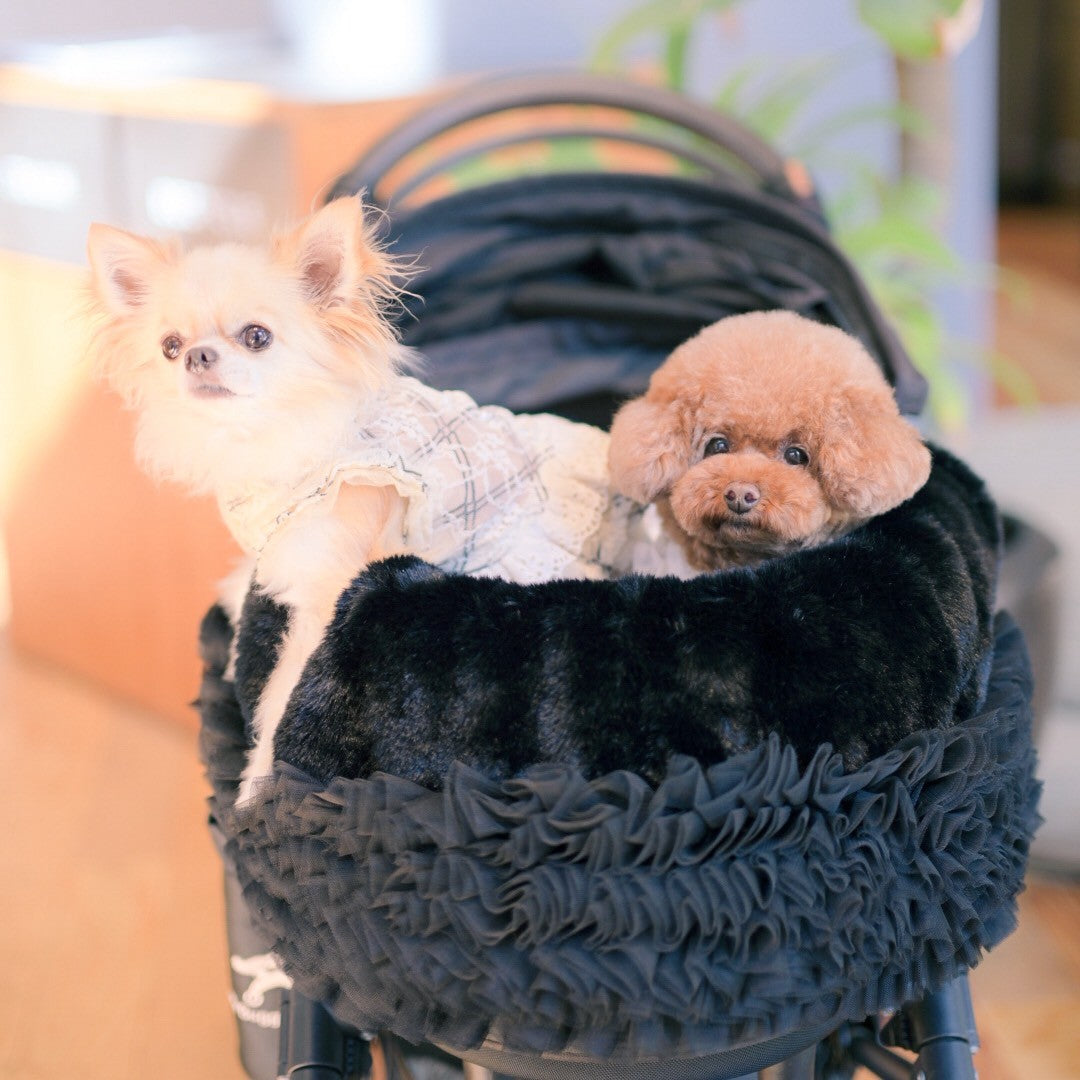 お出かけの時間をもっと特別に。カートに載せるだけで、ふんわりとした華やかさをプラスできるカートカバーです。 贅沢にあしらったブラックチュールフリルを、上品なフェイクファーの上に重ねて仕立てました。チュールの透け感とファーの柔らかさが重なり、動くたびにエレガントな印象を演出します。 裏面もフェイクファー仕立てなので、カートカバーとしてだけでなく、取り外してそのままカフェマットとしてもご利用いただけます。「あるときはカートのフリルカバー、あるときはカフェでマット」と、一枚で二役。持ち運びにも便利で、お出かけ先の映え写真にもぴったりです。 取り付けはマグネット式ではなく、安全ベルトタイプを採用。画像の様にアジャスタブルナイロンベルトをカートのフレームに通して、しっかり固定できるので、愛犬が動いてもズレにくく安心してお使いいただけます。 特徴 ブラックチュールフリル×フェイクファーでシック&高級感あるデザイン 裏側もフェイクファー仕立てでふんわりやさしい肌触り 安全ベルトでしっかり固定、安心設計 どんなカートやお洋服にも合わせやすいブラックカラー お出かけや撮影シーンに映える華やかデザインです。※商品の発送は、10月17日頃を予定しております。☆取付例としてご紹介しているのは、・AIR BUGGY DOME3 レギュラーサイズ・ロイヤルテイルズ フローレンス 折り畳みが出来るタイプ です。