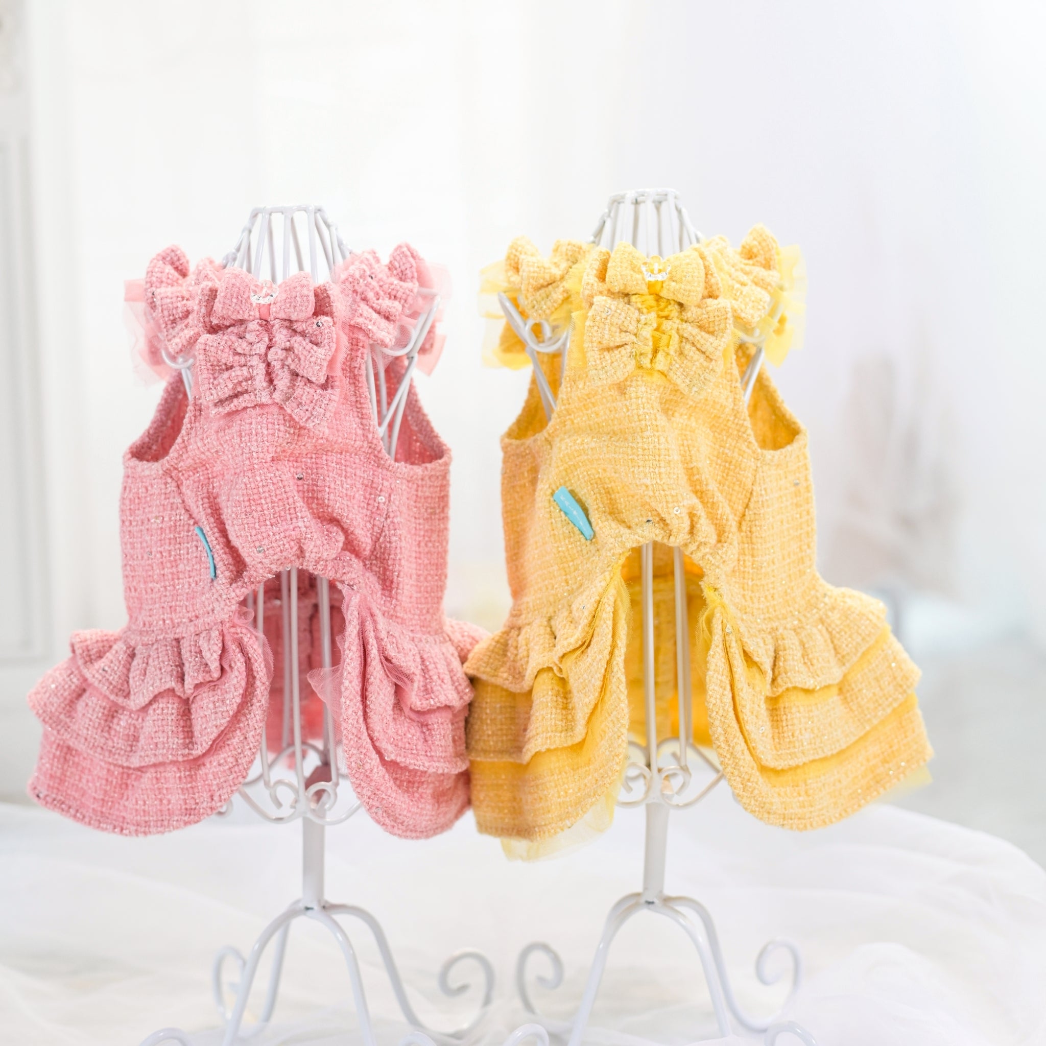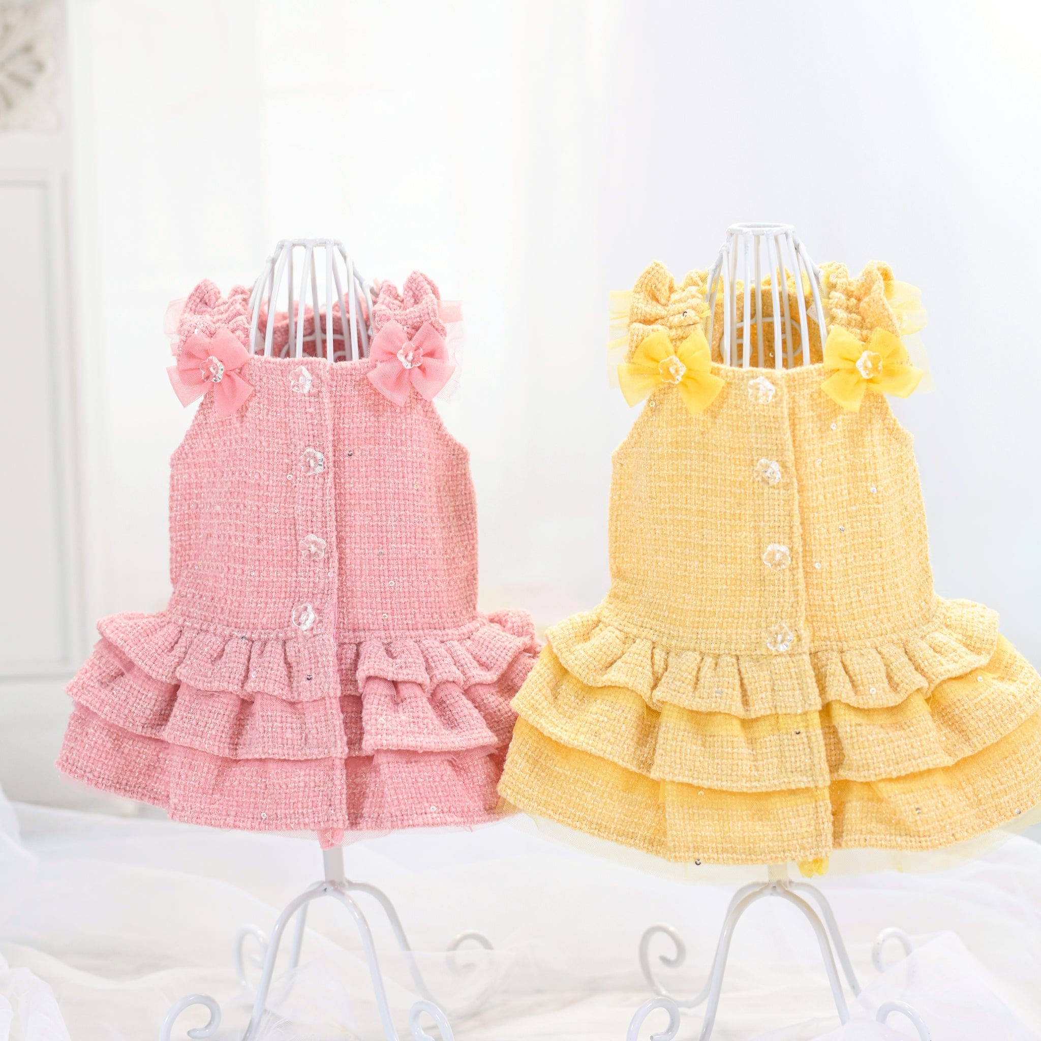 商品は4月1日発送予定のご予約商品となります。程よい厚みのあるツイード生地を使用した、上品で華やかなスプリングツイードワンピース。 しっかりとした生地感により、裾フリルが美しく立ち上がり、立体感のあるエレガントなシルエットを演出します。 カラーは イエローとピンクの2色イエローはミモザを思わせるやさしい春カラー、ピンクは桜の季節にぴったりな華やかなカラーです。 胸元のリボンときらめくビジューが、さりげない可愛らしさと上品さをプラス。 特別なお出かけや撮影にもぴったりの、春らしい一着に仕上げました。 ※こちらの商品は伸縮性がありません※後ろぱちぱちボタン開きで着脱らくらくです。