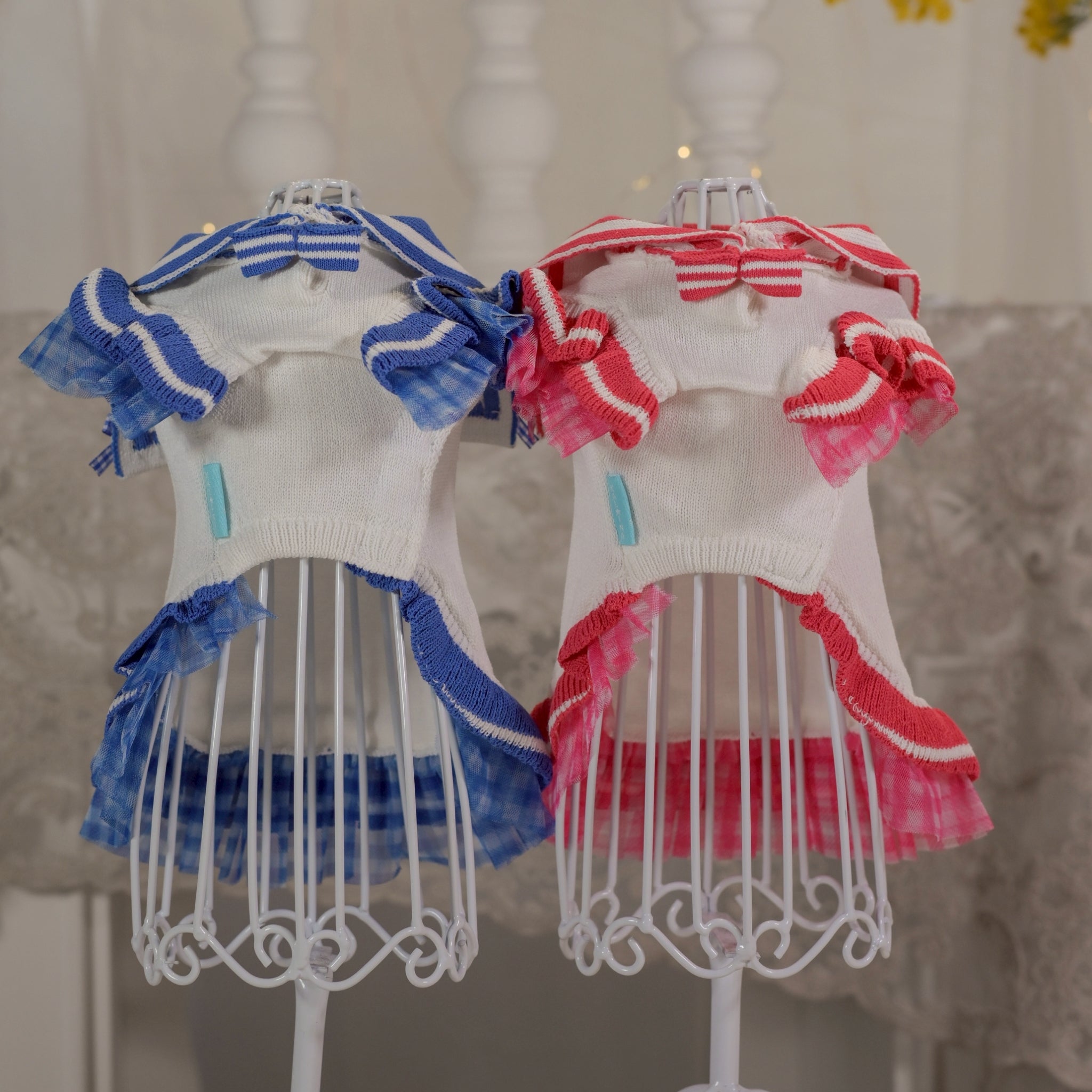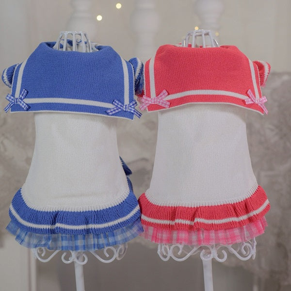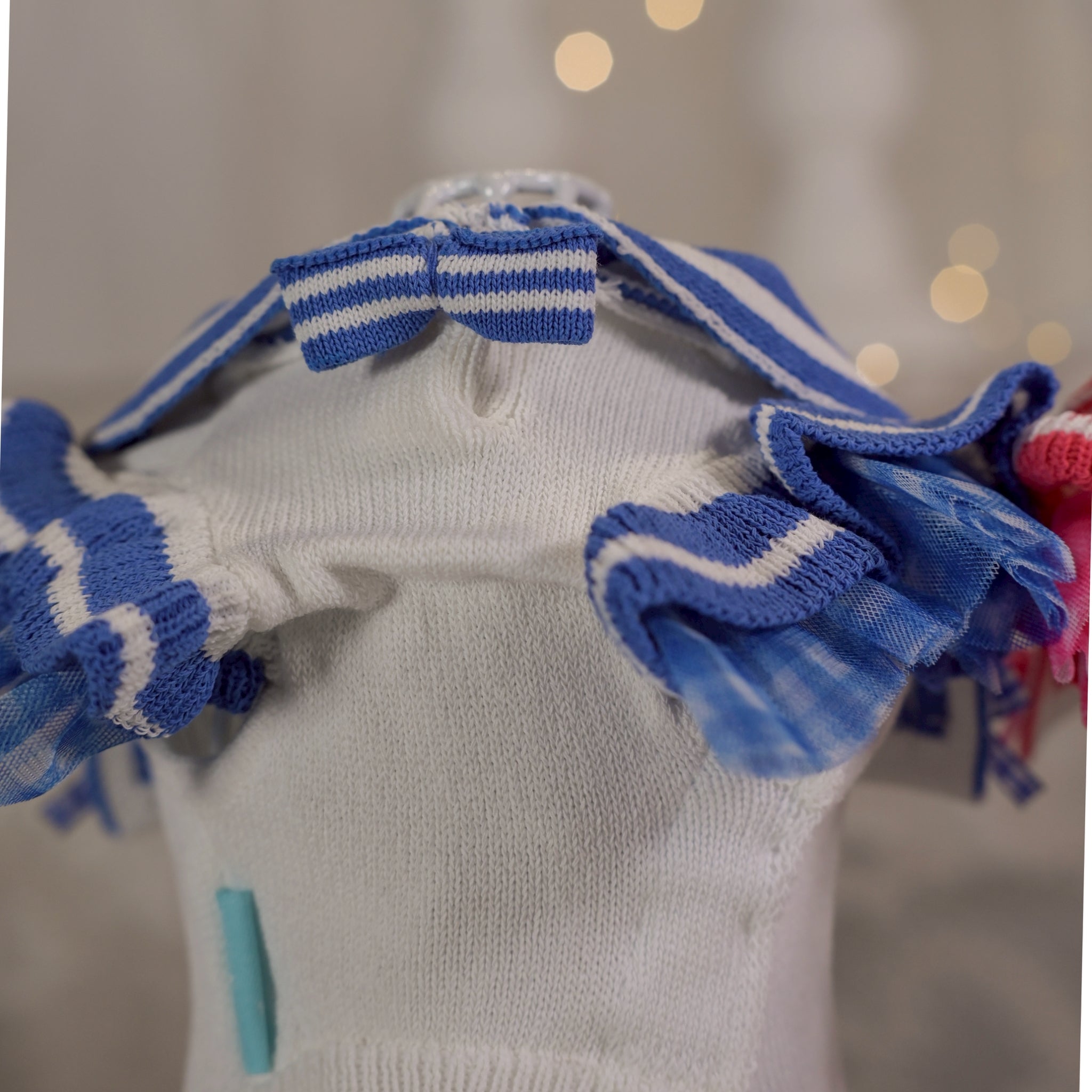 UVカット加工ニット素材を使用した軽やかで心地よい着心地のセーラーワンピース。UVカット加工ニット素材を使用(UPF評価15) 日差しの気になる季節のお出かけにやさしい紫外線対策をプラスしてくれる一枚です。※UVカットは補助的機能であり、完全な紫外線遮断を保証するものではありません。 フリル部分にはギンガムチュールをあしらい、春夏らしいさわやかな印象に仕上げました。 紫外線対策を叶えながら、上品さと可愛らしさを兼ね備えたKALINAらしい一枚です。 カラーは白×ピンク / 白×ブルー の2色展開。