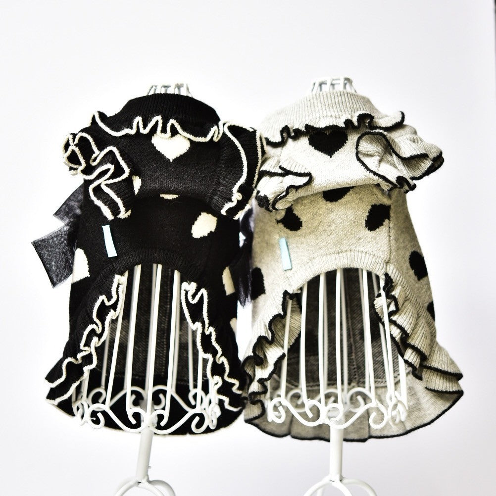 カシミヤ混素材を使った、柔らかで着心地の良いワンピース。新色 黒 を追加しました。 カラーは グレーベージュ・オレンジピンク・黒 の3色展開になります。 後身の大きなリボンと肩・裾のチュールフリルが、わんちゃんを華やかで可憐にみせてくれます。 背中の透けチュールが軽やかで、わんちゃんの髪の毛の色が透けて良い感じ。普段のお出かけから撮影会やイベントまで、幅広く活躍する一枚です。 カラー展開 オレンジピンク:明るく華やかで、ハロウィンコーデにもぴったり グレーベージュ:落ち着いたニュアンスカラーで、アンティークな雰囲気の撮影会におすすめ 黒:これからのハロクリシーズンにぴったりです。 ニット素材なので伸縮性あります。こちらの商品は 開きがありませんので 被って着用して頂くデザインです。