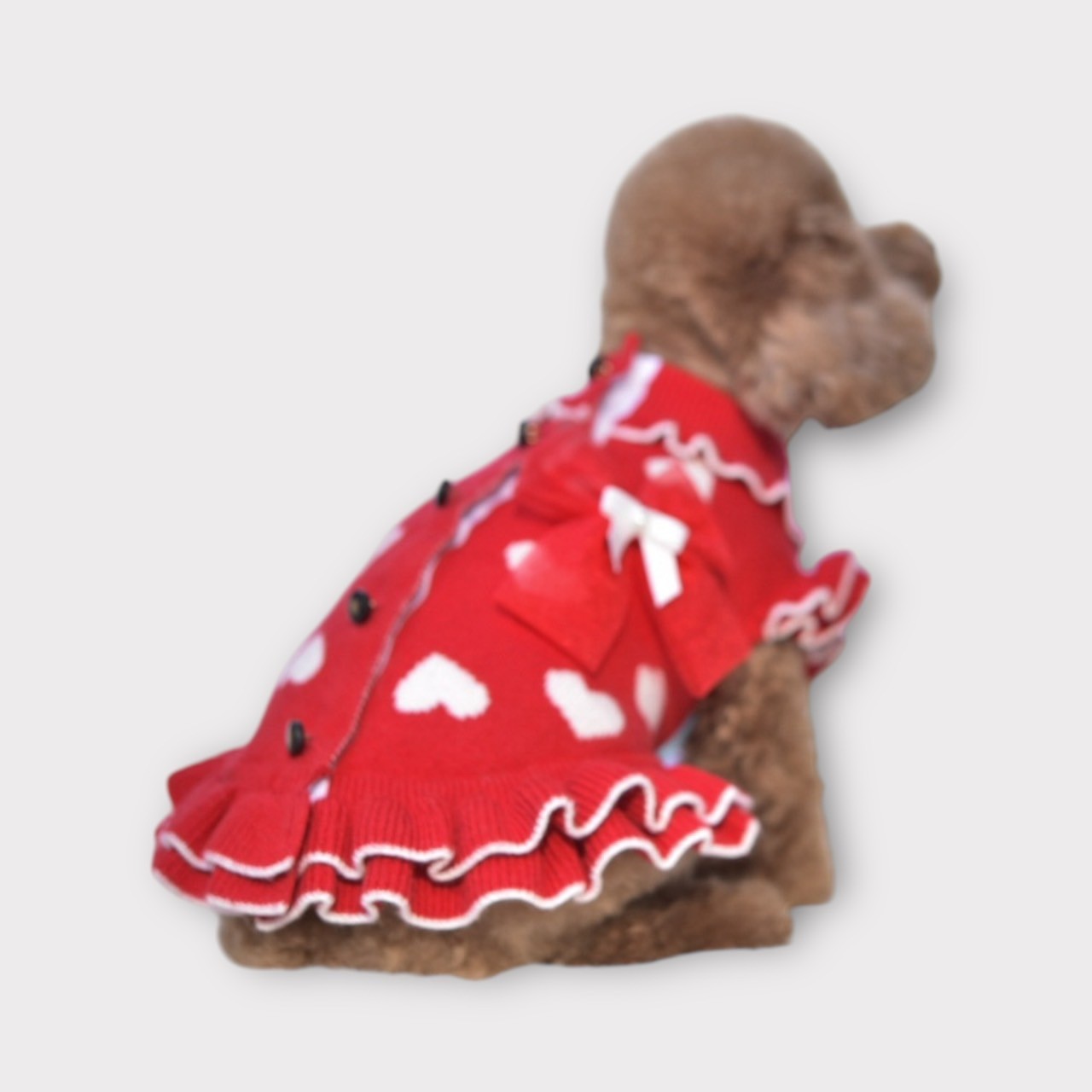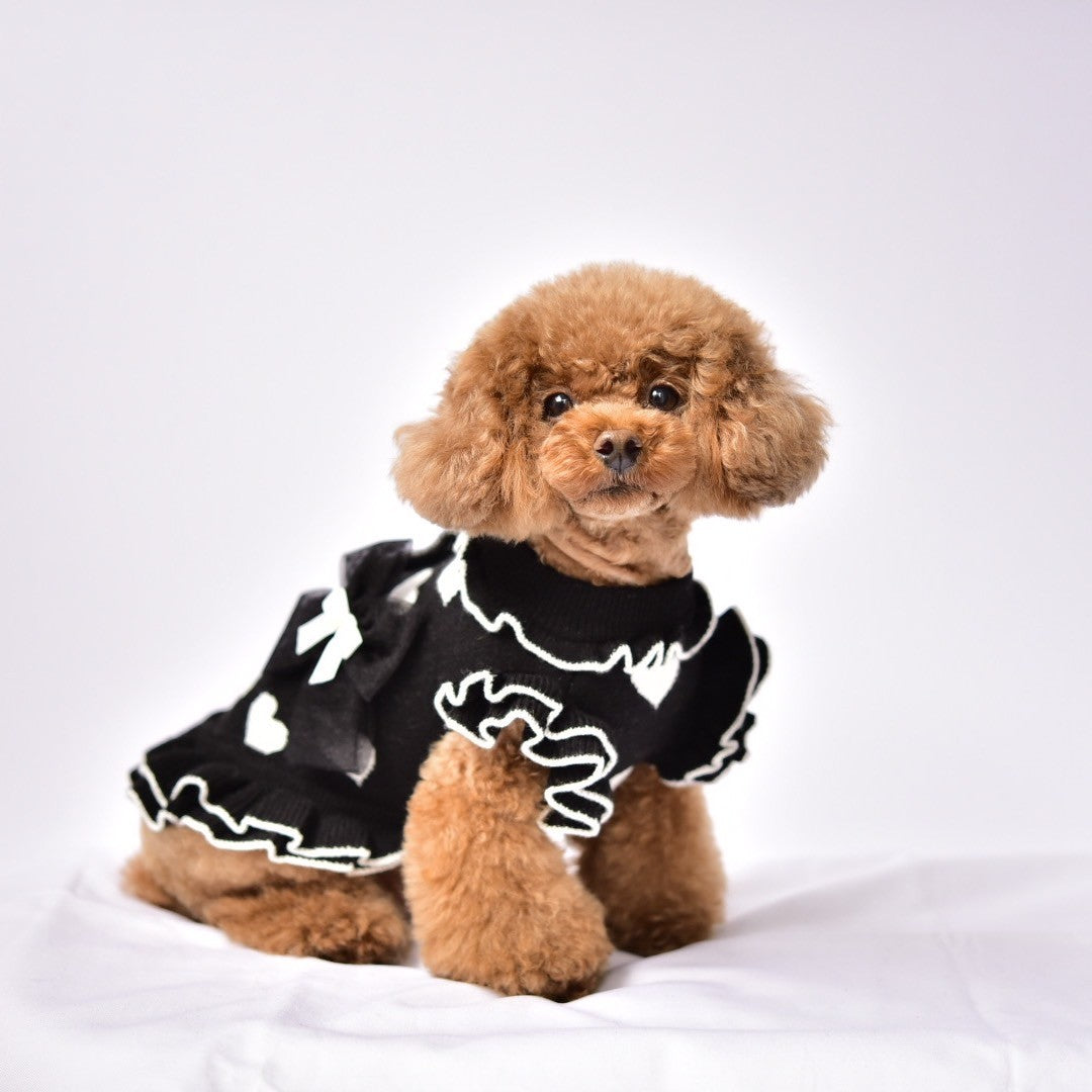 高級感のあるツイード調生地に、ふんわり広がるフリルとリボンをプラス。特別な日のおめかしはもちろん、普段のお散歩やカフェでも楽しめる、毎日着せたくなる一枚です。 着映えするデザインだから、撮影会や記念日フォトにもぴったり カラー展開 ピンク:淡い色合いだから、わんちゃんを ふんわりかわいくみせてくれる♡ 黒:クラシカルな黒が、わんちゃんを 上品にみせてくれる 大人可愛いカラー 特徴 高級感のあるツイード調生地 動くたびに揺れる華やかフリル リボン付きで特別感を演出 伸縮性はありませんので、サイズをご確認ください 着映えするデザインなので、撮影会やお散歩フォトにもぴったりです 伸縮性はありません。後ろパチパチ釦になりますので 着脱らくらくですね。