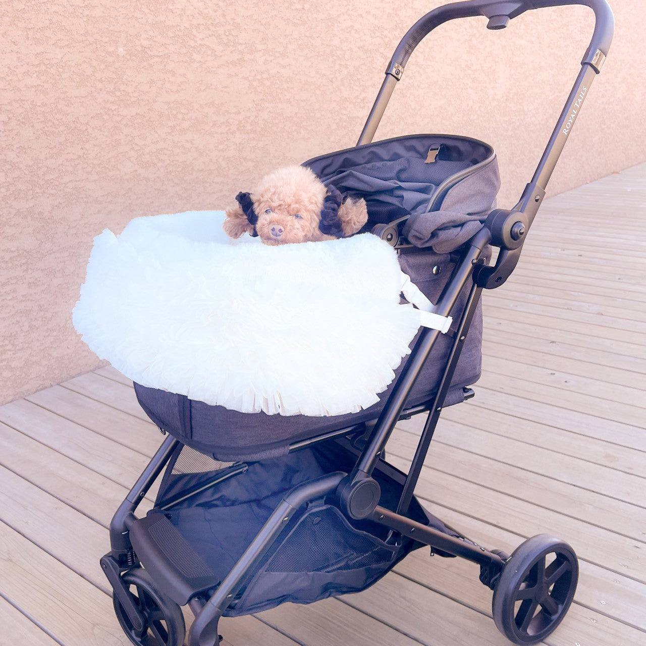 “新色ホットミルク” が仲間入りしました。黒とミルクティ(ベージュ系)とホットミルク(白系) の3色展開になりました。 ※ミルクティーは、次回入荷1/10の予定でご予約受付中です🙇 お出かけの時間をもっと特別に。カートに載せるだけで、ふんわりとした華やかさをプラスできるカートカバーです。 ホットミルク(Hot Milk/新色)ほわっとやさしいアイボリー系の白。冬の空気に溶け込むようなあたたかさがあり、可愛い写真が撮れる大人気のふんわりカラー。 ミルクティー(ベージュ系)は、柔らかなミルクティーベージュのフェイクファーに上品なチュールフリルを重ねて仕立てました。優しいトーンがどんなお洋服にも馴染み、お出掛けを彩ります。黒は、贅沢にあしらったブラックチュールフリルを、上品なフェイクファーの上に重ねて仕立てました。チュールの透け感とファーの柔らかさが重なり、動くたびにエレガントな印象を演出します。 裏面もフェイクファー仕立てなので、カートカバーとしてだけでなく、取り外してそのままカフェマットとしてもご利用いただけます。「あるときはカートのフリルカバー、あるときはカフェでマット」と、一枚で二役。持ち運びにも便利で、お出かけ先の映え写真にもぴったりです。 取り付けはマグネット式ではなく、安全ベルトタイプを採用。画像の様にアジャスタブルナイロンベルトをカートのフレームに通して、しっかり固定できるので、愛犬が動いてもズレにくく安心してお使いいただけます。 特徴ホットミルクフェイクファー×チュールフリルでふんわりカラー。 ミルクティーフェイクファー×チュールフリルでナチュラル&優しいデザインブラックフェイクファー×チュールフリルでシック&高級感あるデザイン 裏側もフェイクファー仕立てでふんわりやさしい肌触り 安全ベルトでしっかり固定、安心設計...