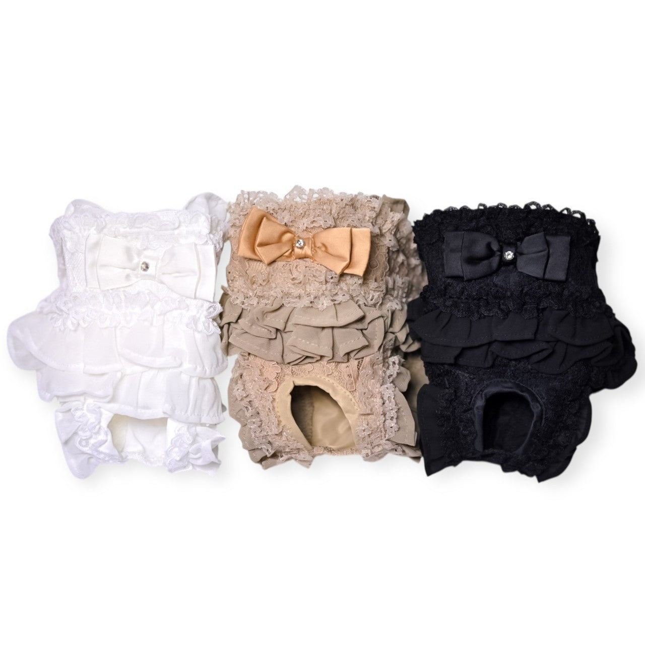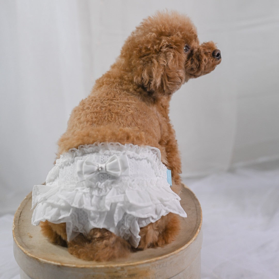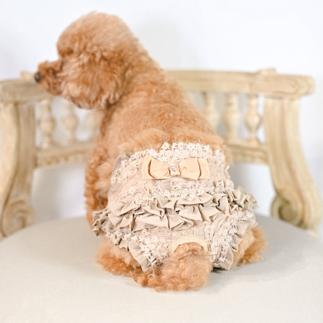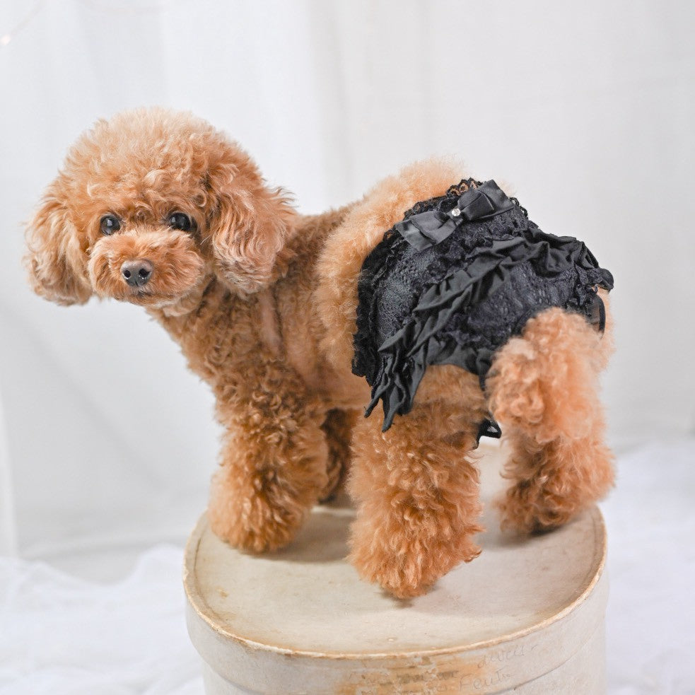 新色 黒を追加しました。 前身がシャーリングになっているので とても着心地がよいですよ。 ふんわり可愛いシャーリングデザインに、繊細なレースを重ねた上品なワンピース。胸元のリボンとフリルがアクセントになり、特別なお出かけや記念撮影にもぴったりです。 なんと、このワンピースに使われている生地は 大人気「するっと履けるマナーパンツ」と同じ素材。通気性がよく、柔らかく伸縮性もあるので、わんこにとって快適な着心地です。 デザイン:前身はシャーリング加工で体にやさしくフィット 素材感:軽やかで柔らかい生地にレースをプラス カラー:ピンク(華やかで可愛い)、ベージュ(ナチュラルで上品)、黒(これからのシーズンにぴったり) ふんわり可愛いシャーリングデザインに、繊細なレースを重ねた上品なワンピース。胸元のリボンとフリルがアクセントになり、特別なお出かけや記念撮影にもぴったりです。 ポイント:人気マナーパンツと同じ生地で安心&快適 動きやすさと可愛さを兼ね備えた一着で、普段使いから撮影会、パーティーまで幅広く活躍します。 伸縮性はありません。後ろパチパチ釦あきで着脱らくらくです。